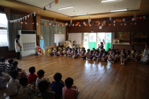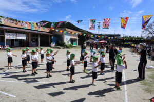 15日から朝の体操が始まりました。元気いっぱい、どうぶつ体操で体を動かして楽しい1日がスタートします! めろん組さんのお当番さんが朝の放送をしてくれて、体操が始まります。