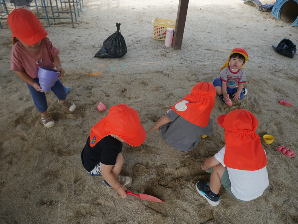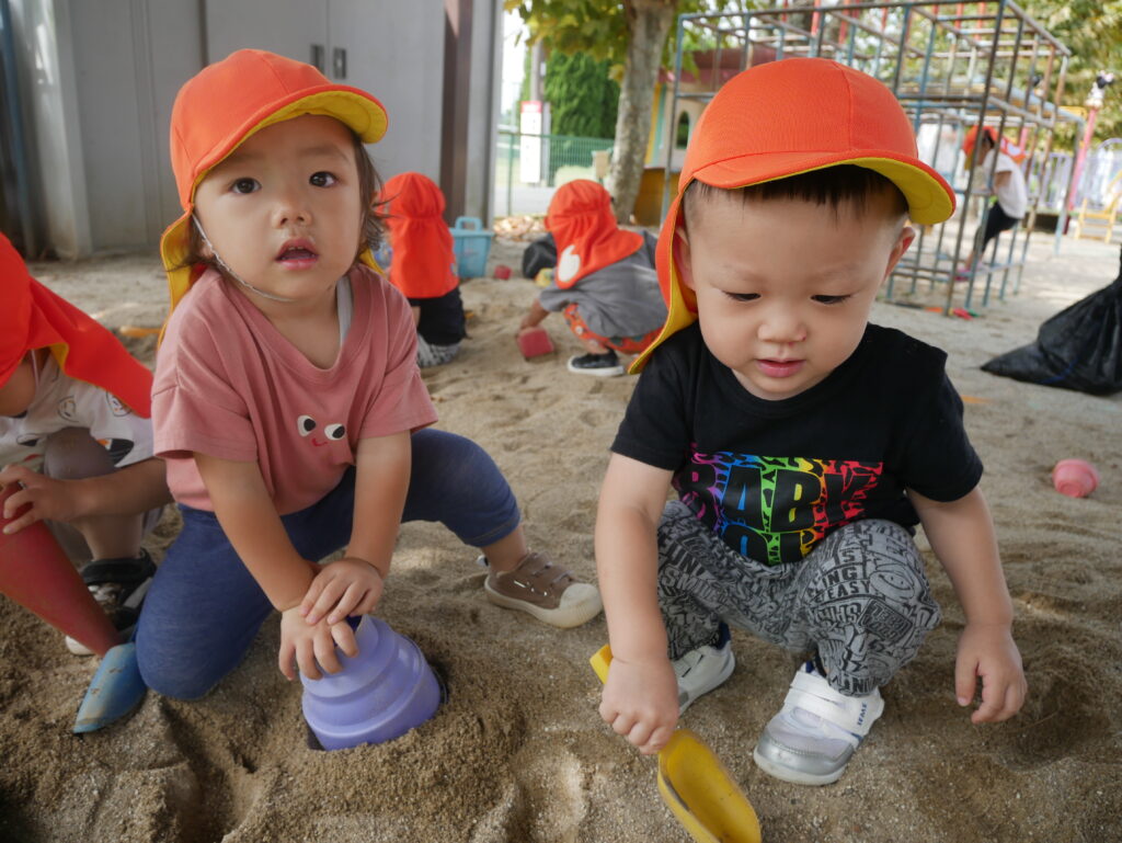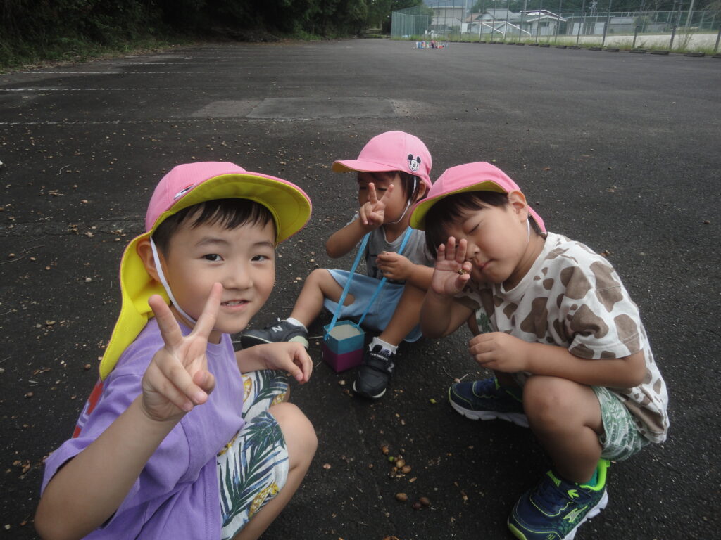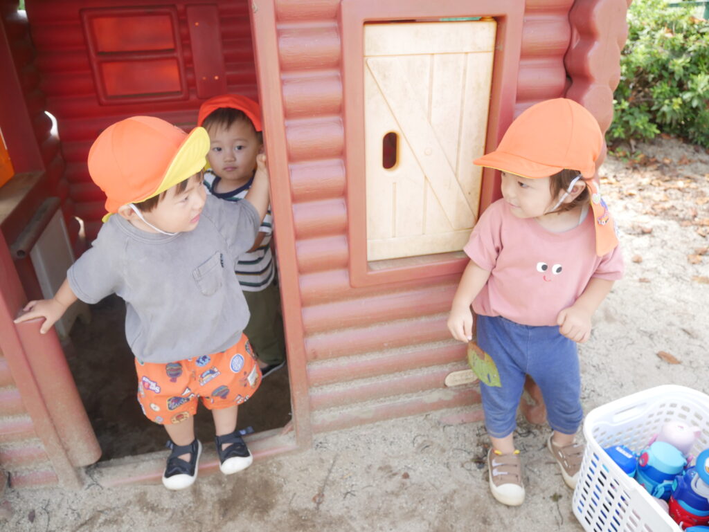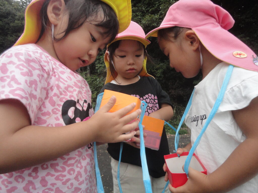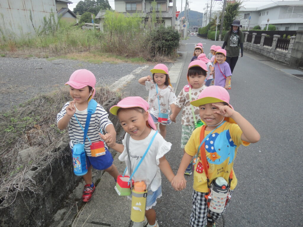 涼しくなってきたので、いちご組は戸外、りんご組は白山神社へお散歩に行きました。