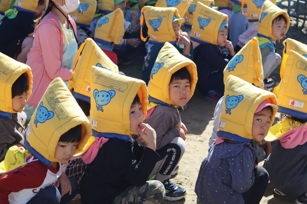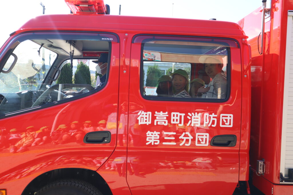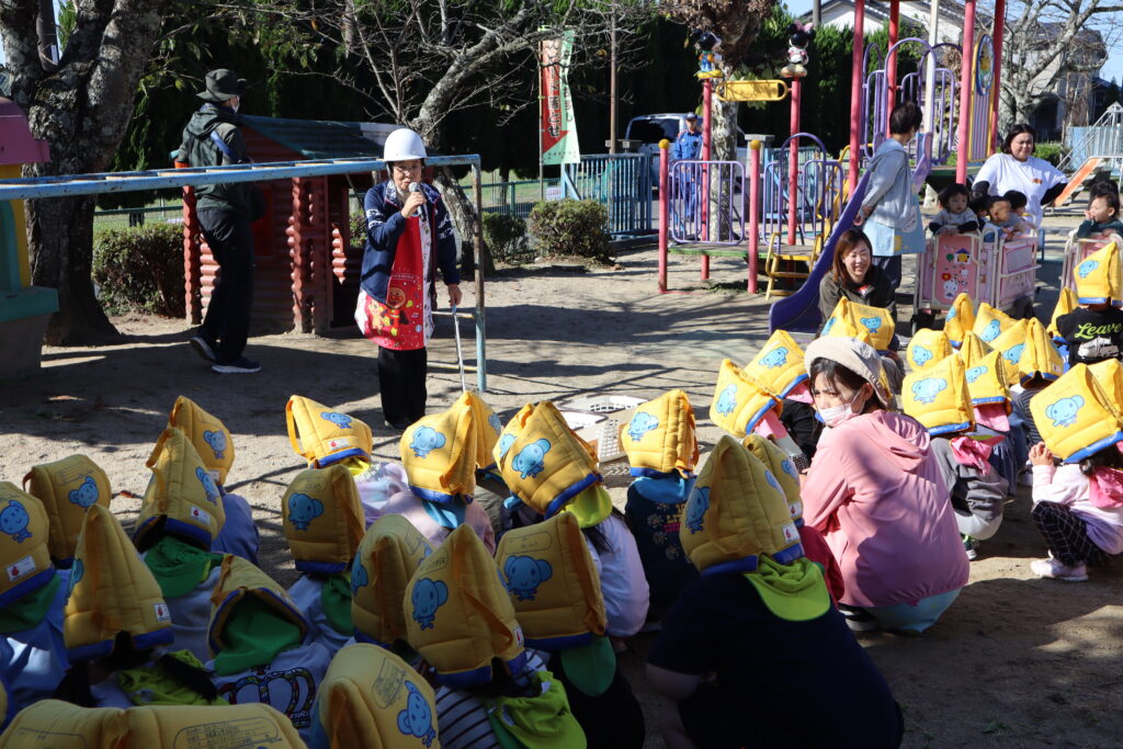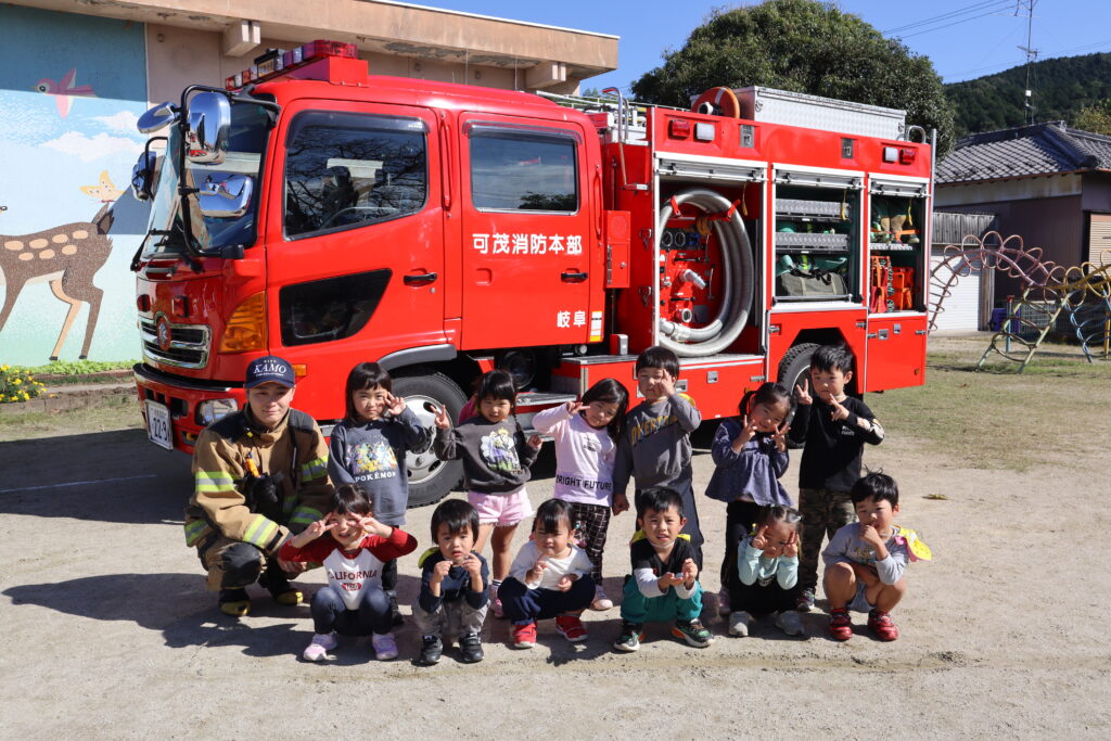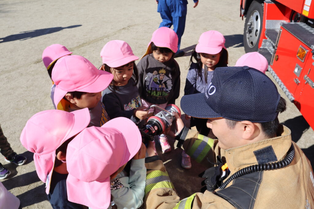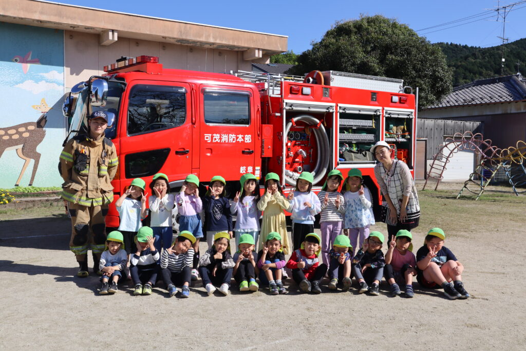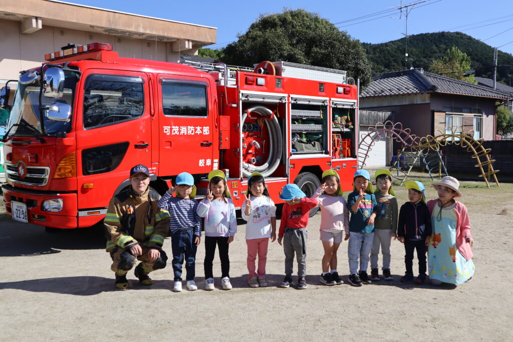 幼年防火教室があり、消防車が保育園に来てくれました!園庭に消防車がくると子ども達は大喜び!以上児さんは消防車に乗せてもらい、園庭をぐるりと回りました。この日は、同時に通報訓練も行い、サイレンがなると先生の話をよく聞いて、スムーズに避難することができました。