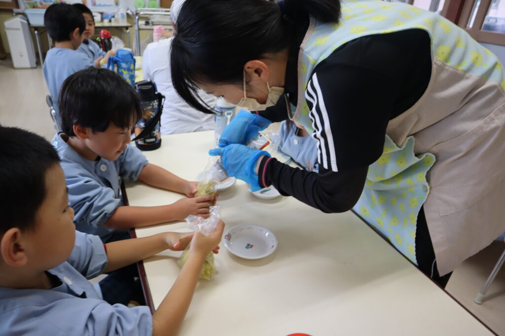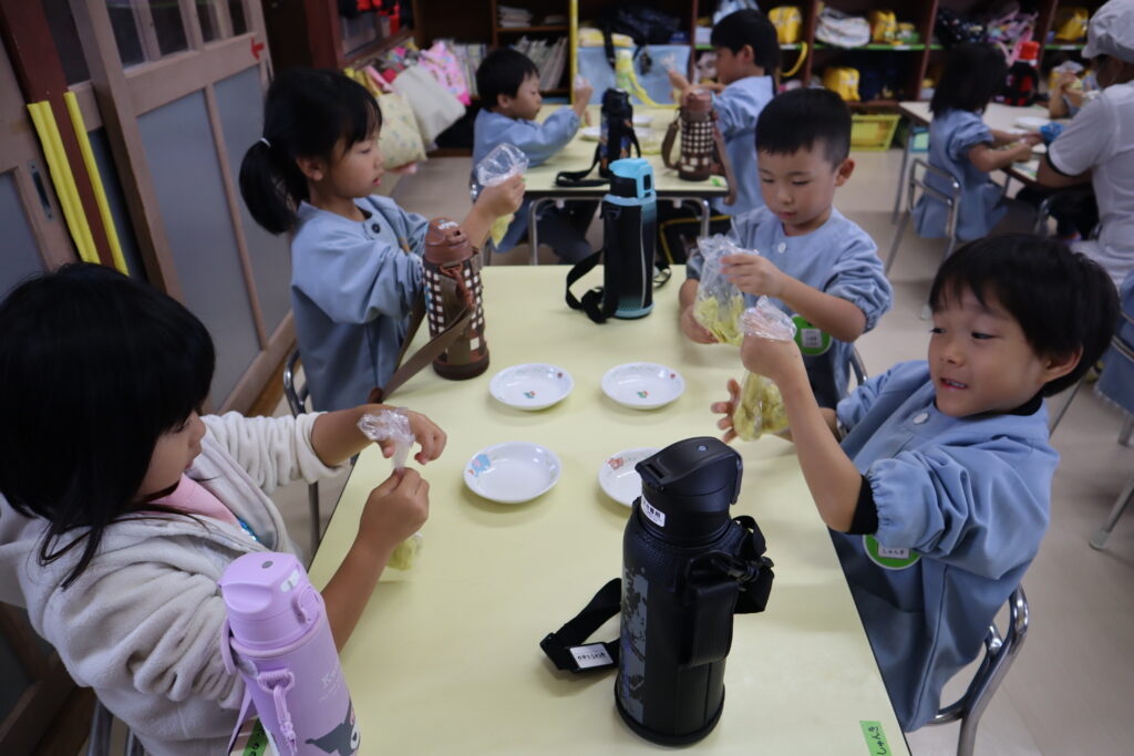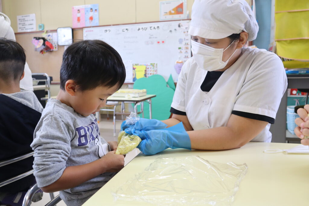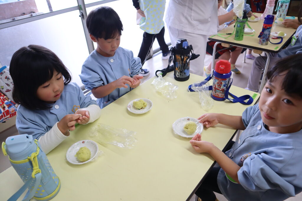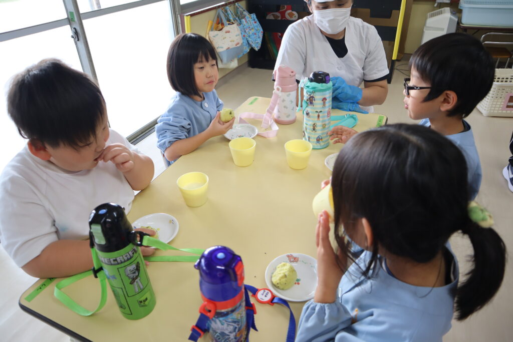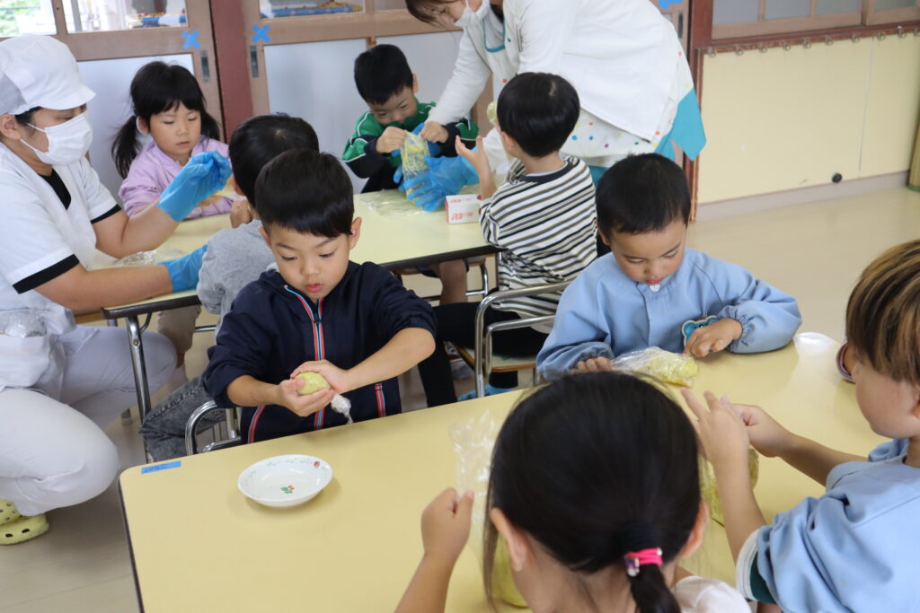 今日のおやつは、芋きんとん!めろん組、ぶどう組のみんなは芋きんとん作りに挑戦しました。自分で作った芋きんとんはおいしかったね♡