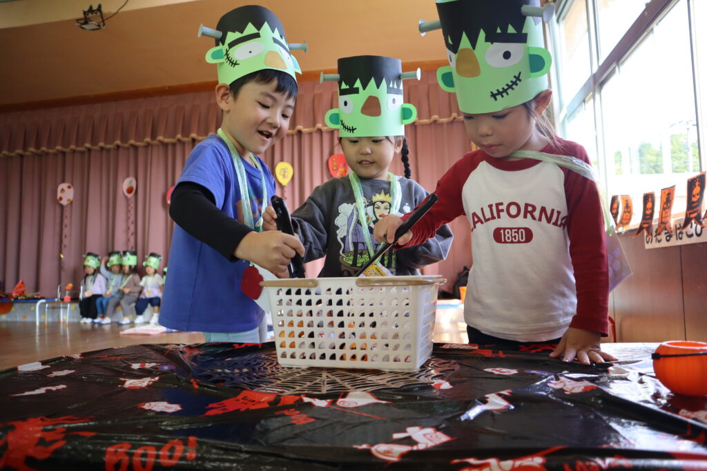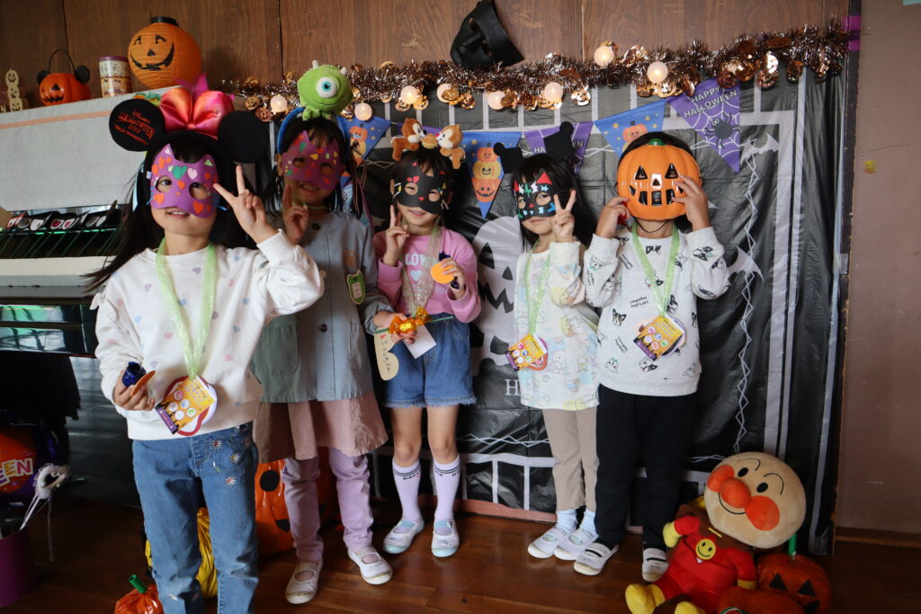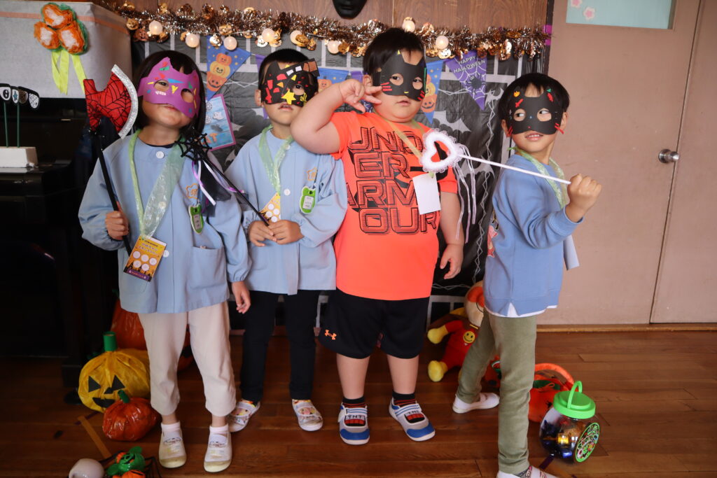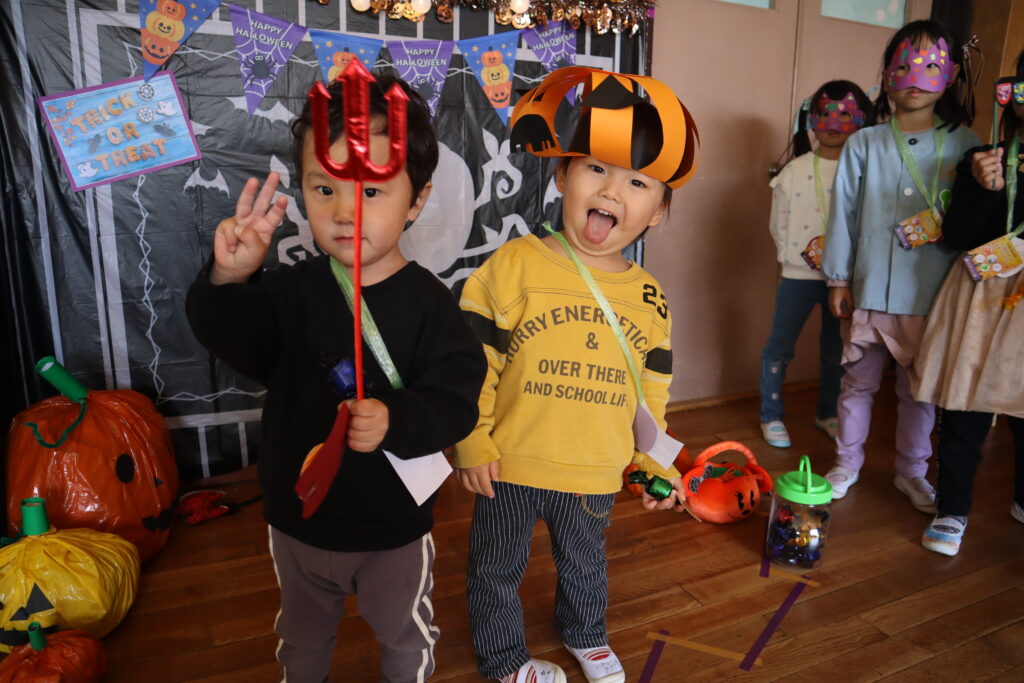 ハロウィンパーティー 2025年10月29日 最終更新日時 : 2025年10月31日 mitakenaka ハロウィンパーティーを行いました。各クラスハロウィンの仮装を作って参加しました。目玉すくい、ボーリング、ハロウィン釣りやトンネルなどたくさんのブースがあり、スタンプラリーをしながら楽しみました。