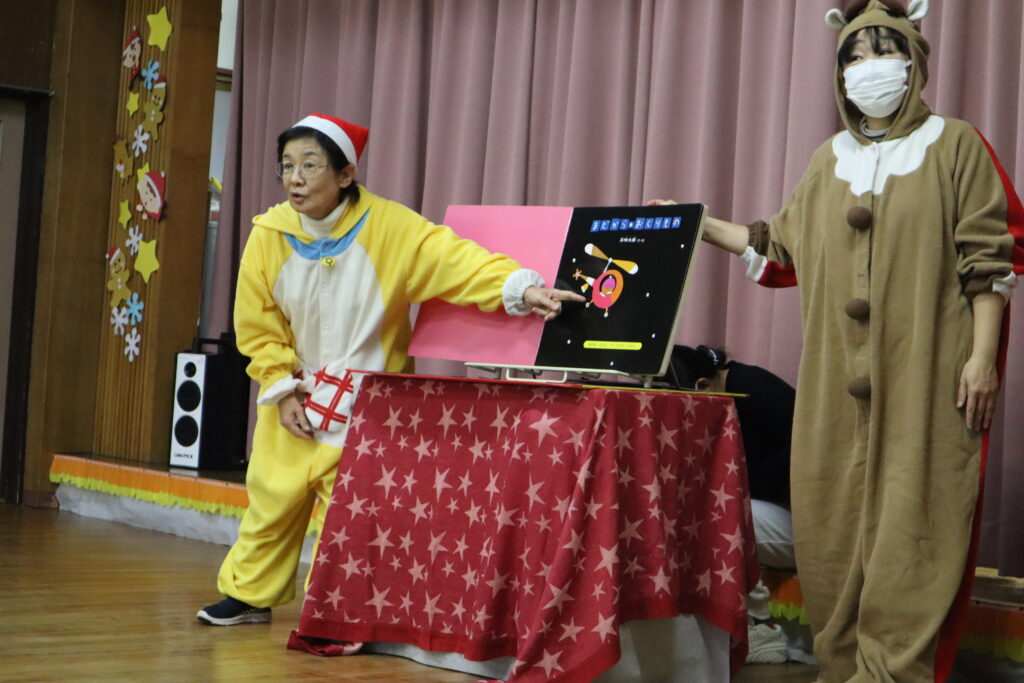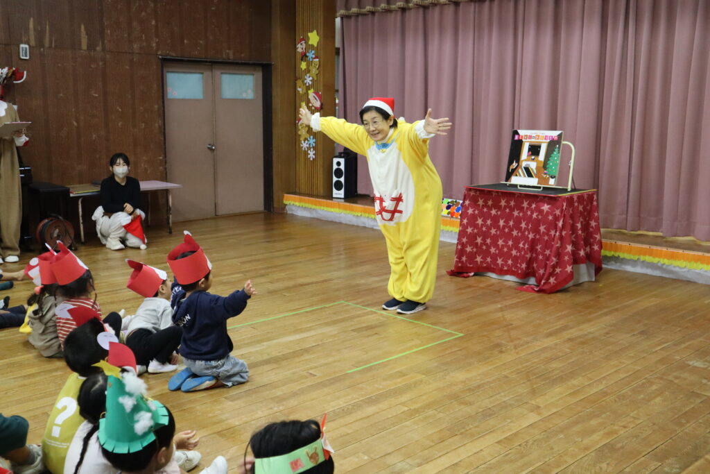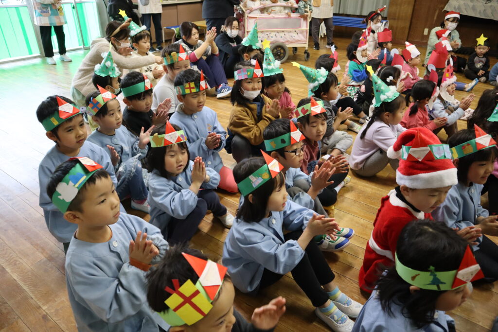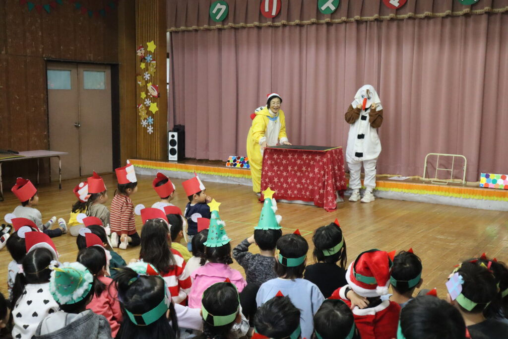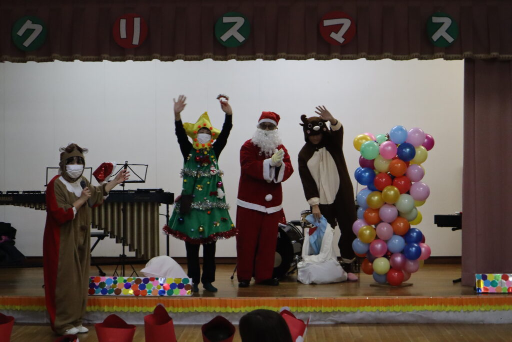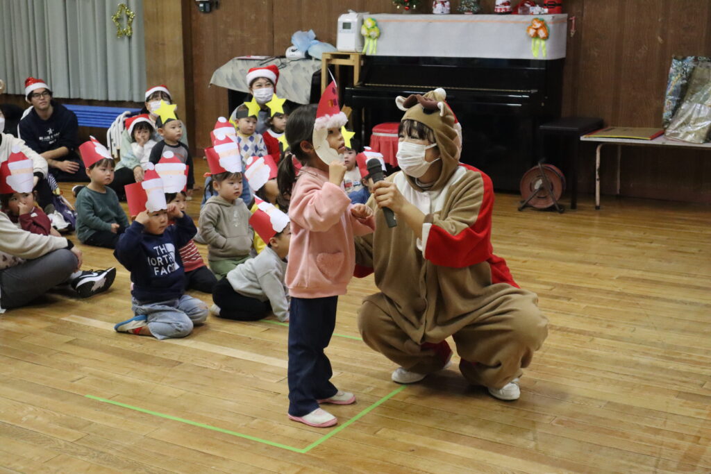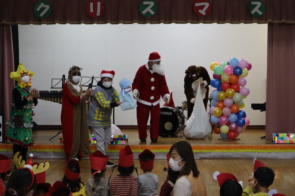 クリスマス会を行いました。先生たちからのお楽しみ、大学生のお兄さん達による楽器の演奏会と盛りだくさんな内容でした。最後にはお楽しみのサンタさんが登場!トナカイさんとクリスマスツリーさんも来てくれました。プレゼントもいただき大満足な子どもたちでした。