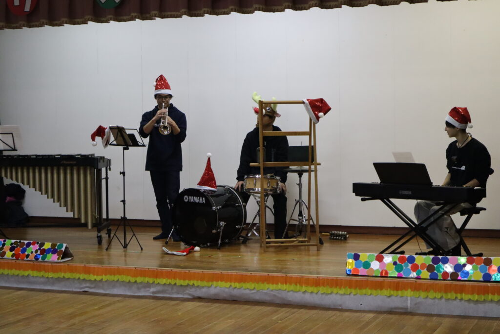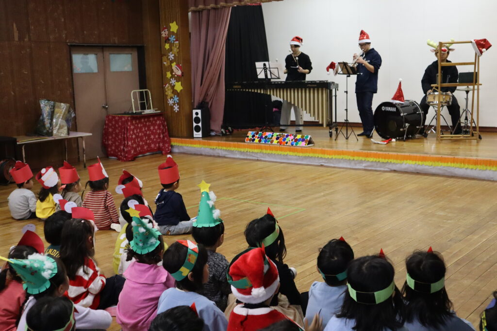 お兄さんたちによるコンサートはトランペット、キーボード、ドラム、マリンバの演奏でした。クリスマスソングや子ども達の大好きな曲をたくさん披露してくれました。一緒に歌ったり、手拍子したり楽しいコンサートでした。