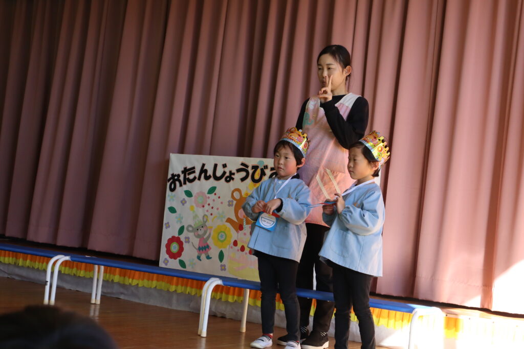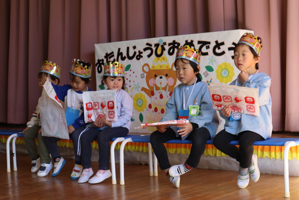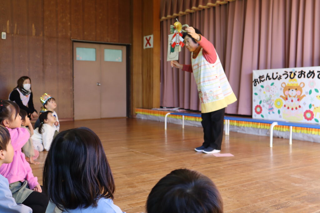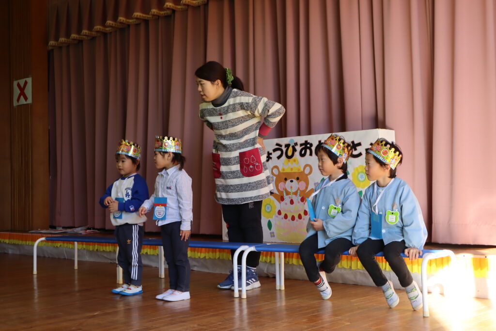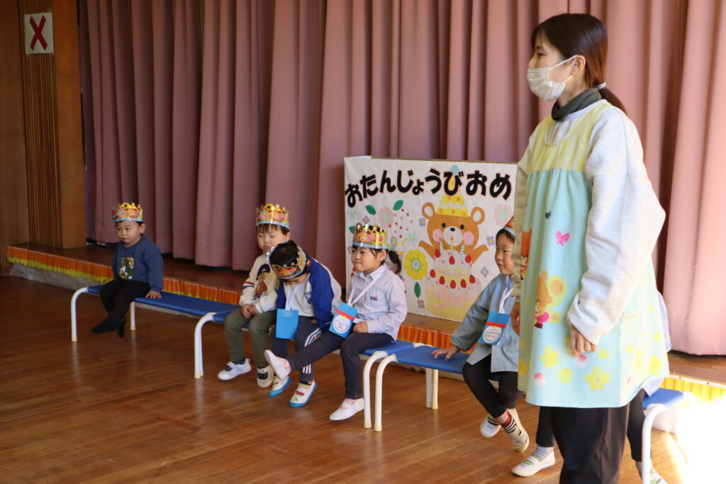 誕生会 2026年1月9日 最終更新日時 : 2026年1月9日 mitakenaka 1月の誕生会を行いました。今月は6名のお友達が元気に誕生日を迎えました。お楽しみのコーナーでは、全園児で〇✖クイズをしましたよ!お正月に関係したクイズでした。大盛り上がりでした。