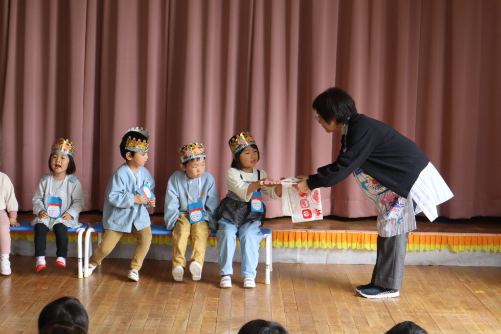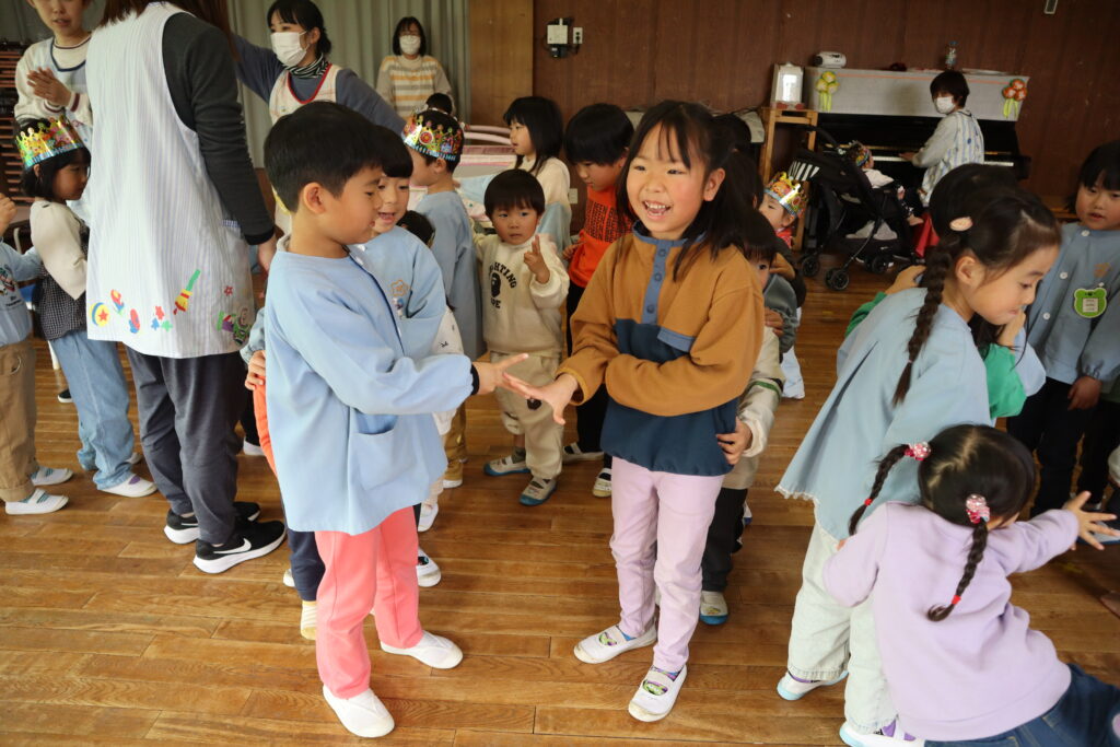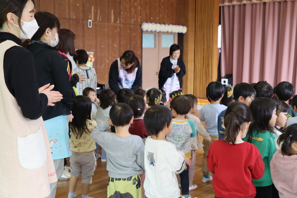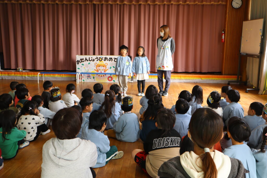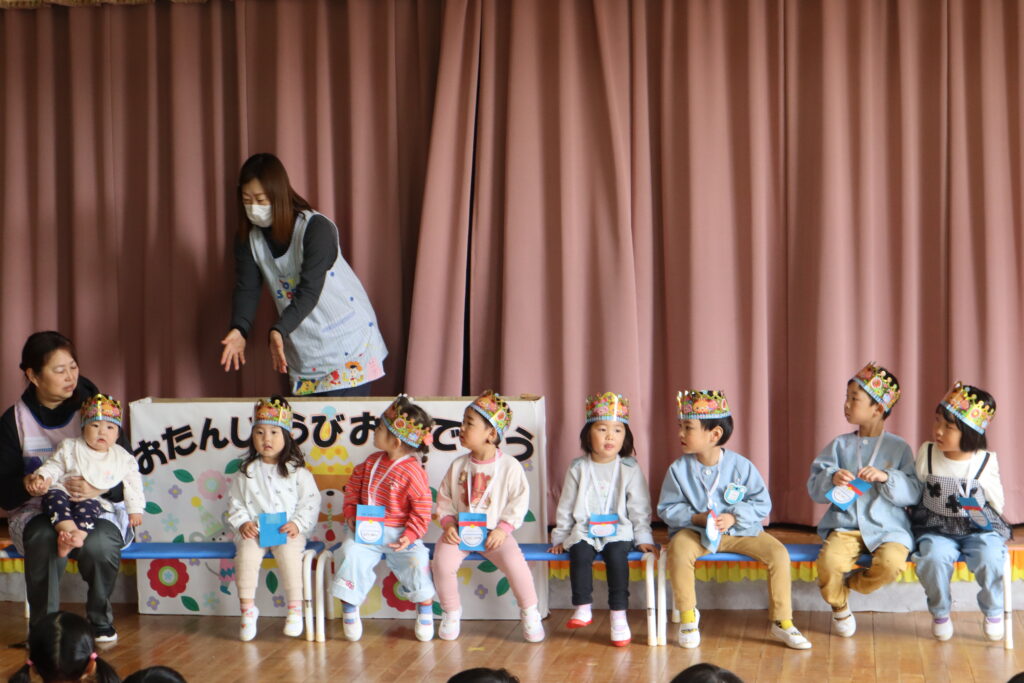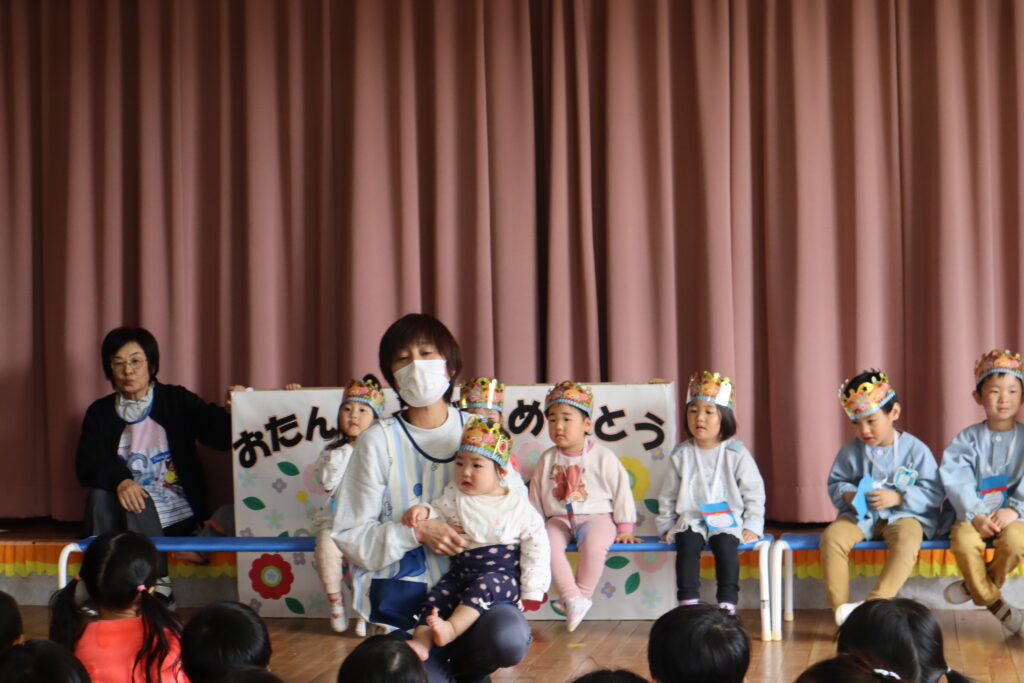 3月の誕生会を行いました。今月は8名のお友達が元気にお誕生日を迎えました。お楽しみでは、全園児でじゃんけん列車をしました。楽しく遊びました。
