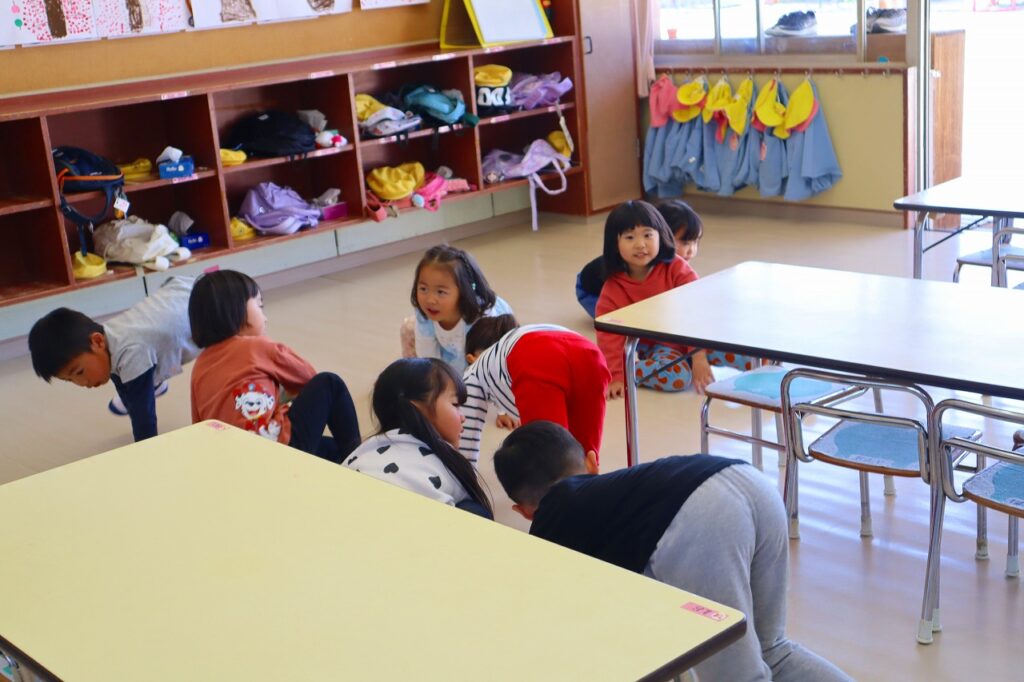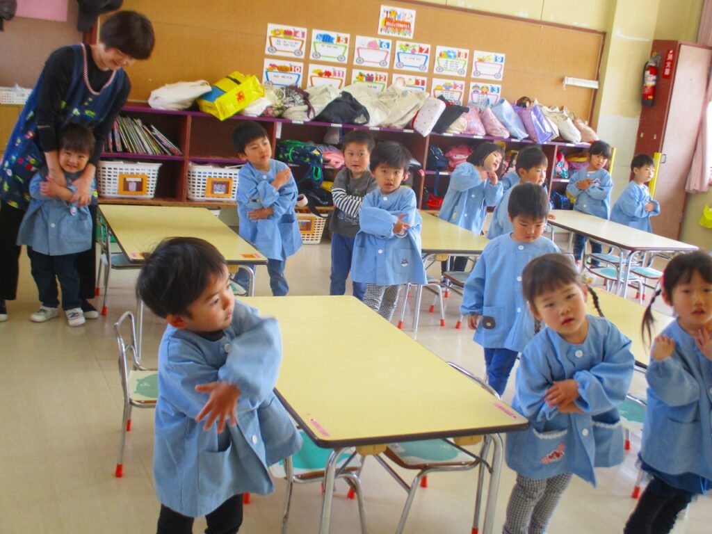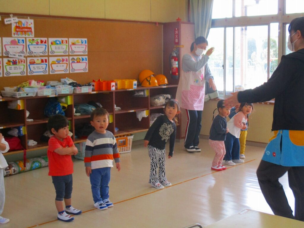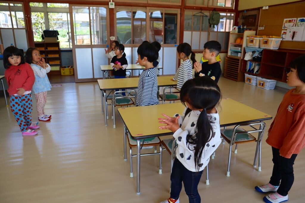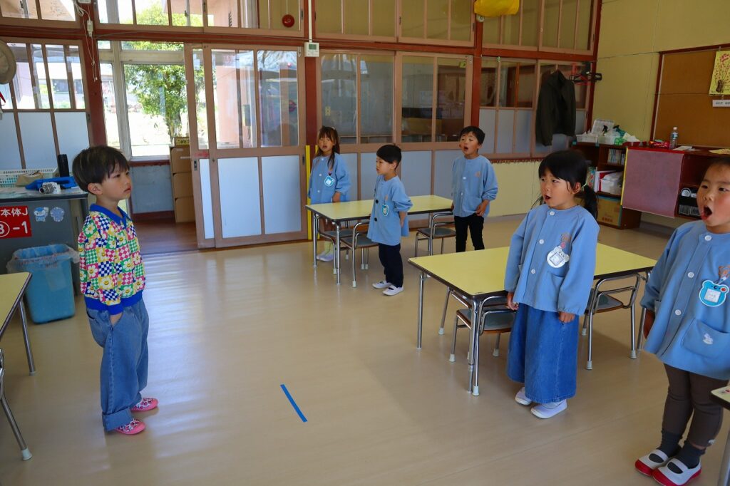 うさぎやへび、ゴリラやあひるになって体操をします。終わると朝の会をし、3歳以上児は、当番が今日の欠席報告を給食先生と園長先生にします。