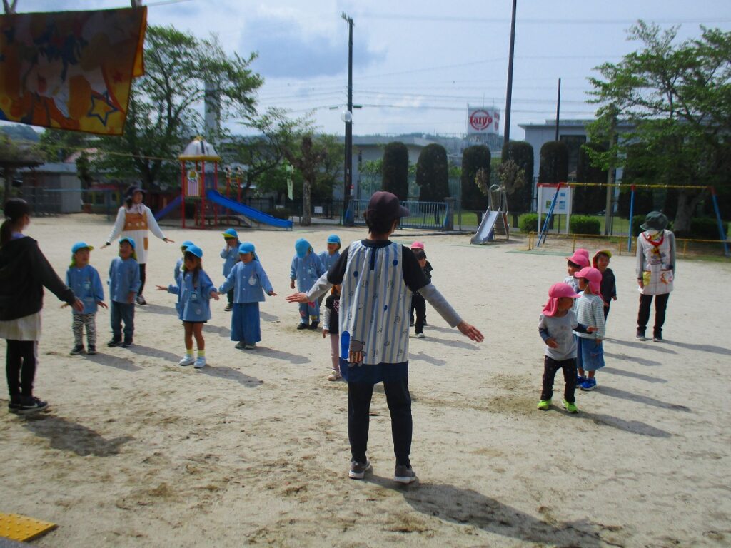 慣らし保育が終わって、朝の体操が始まりました。朝の挨拶、あいうべ体操、バランス遊びをしてから体操をします。今月は「どうぶつたいそう」にチャレンジ!