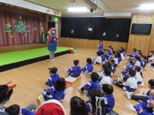 年少児、年中児はかわいいお化けシーツを使って、煙の下の方を逃げる練習をしました。年長児、年中児は消防士や救命救急士などの制服やヘルメットを着用し記念写真を撮りました。