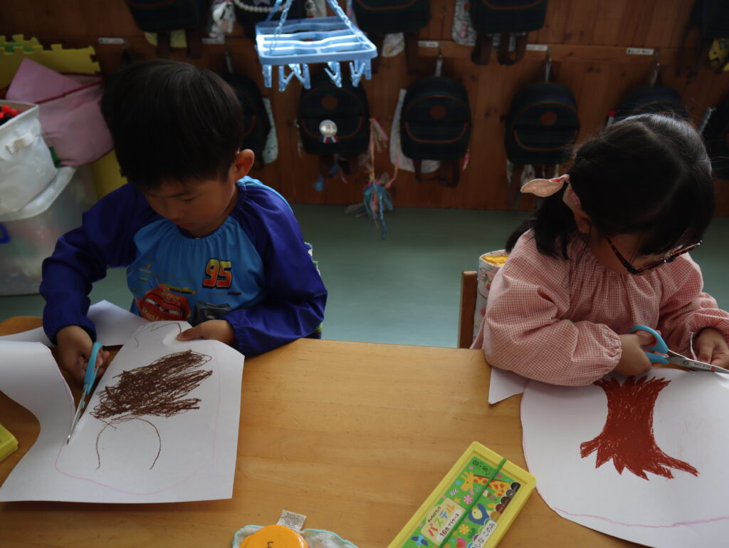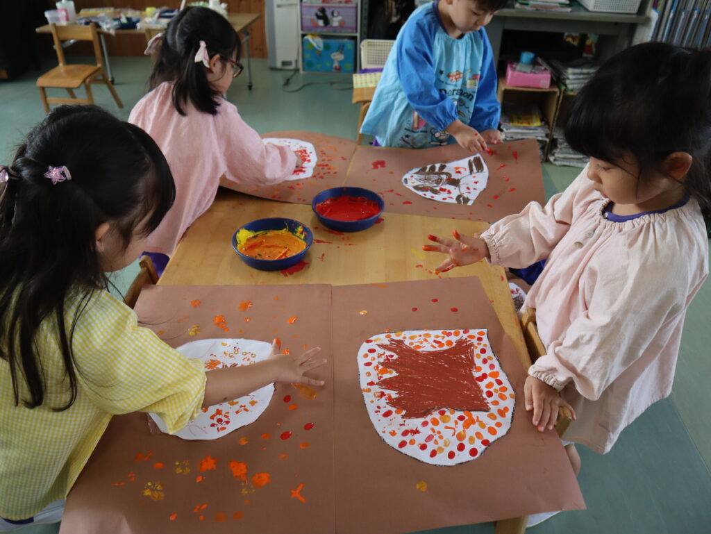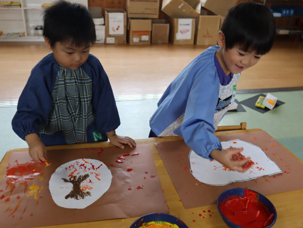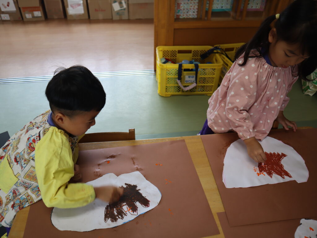 秋の色はどんな色??はさみや、クレパス、絵の具を使って秋を表現しました。
