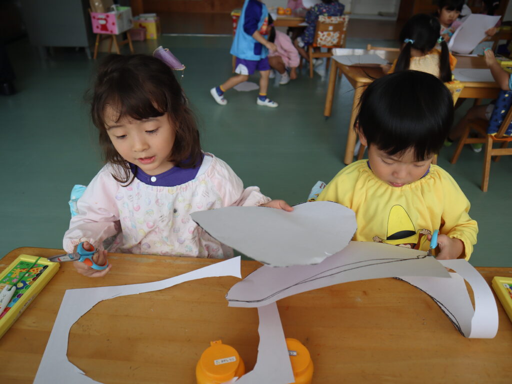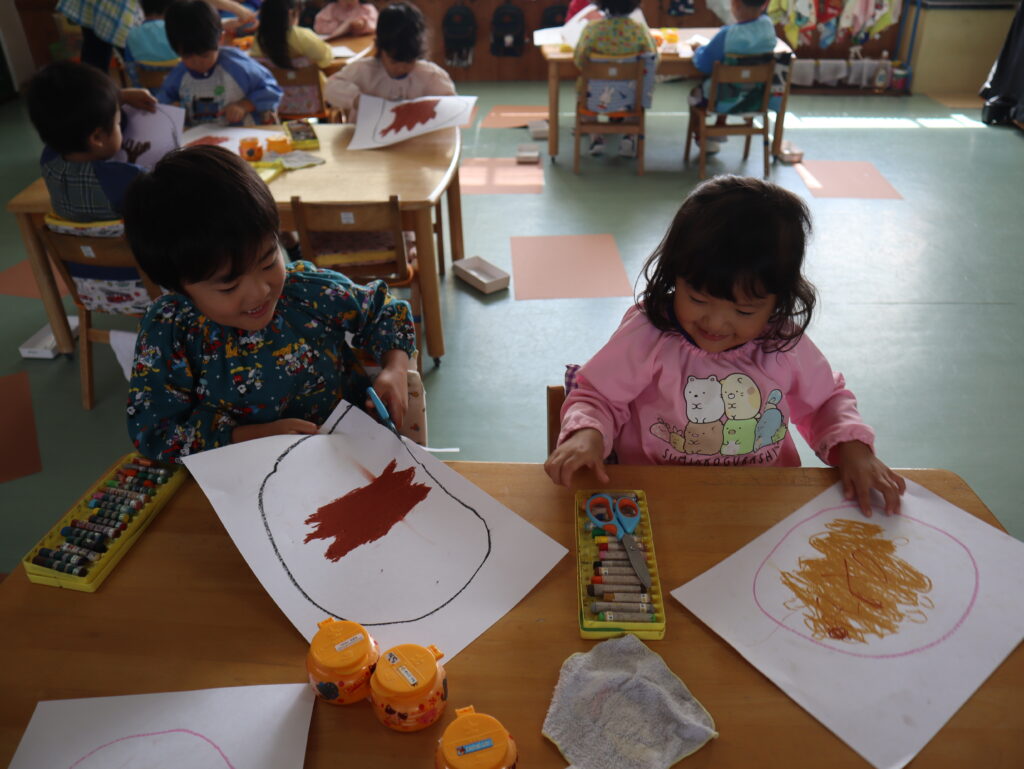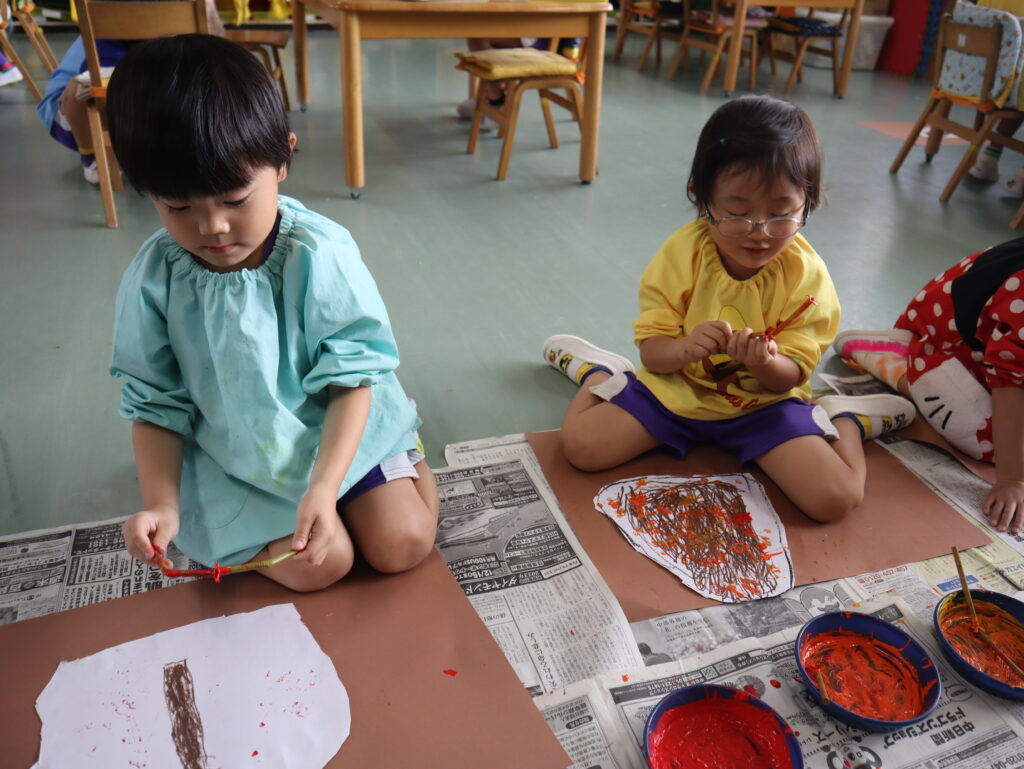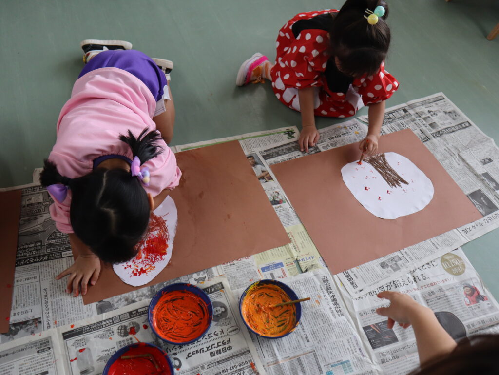 秋の色はどんな色??はさみや、クレパス、絵の具を使って秋を表現しました。
