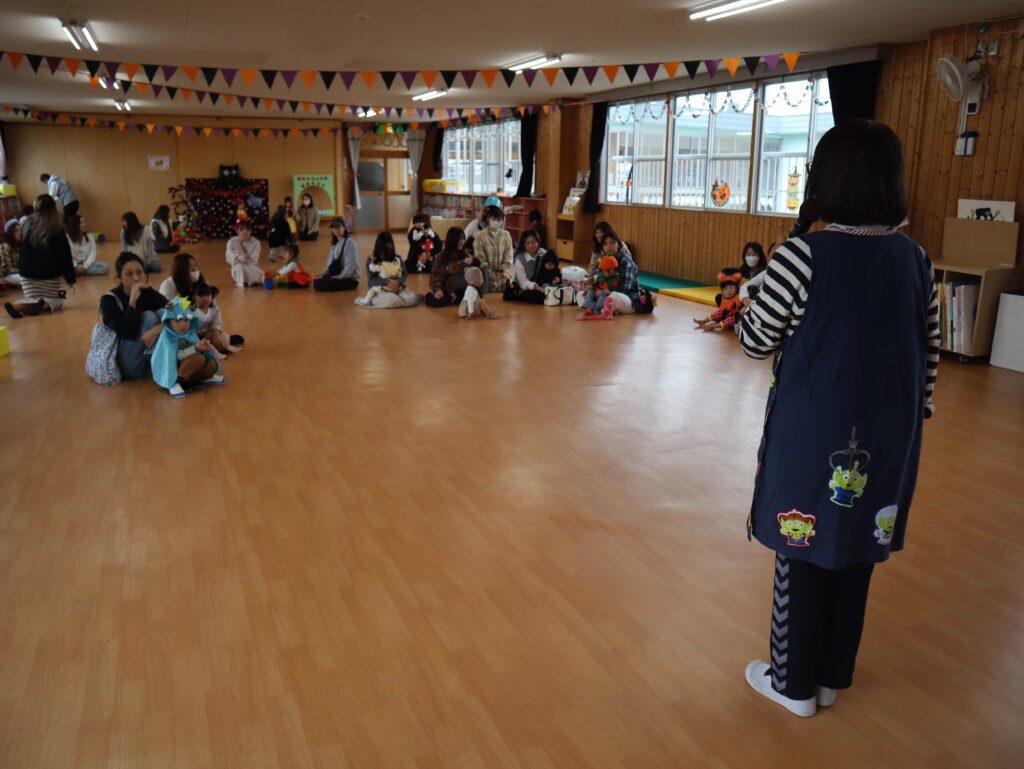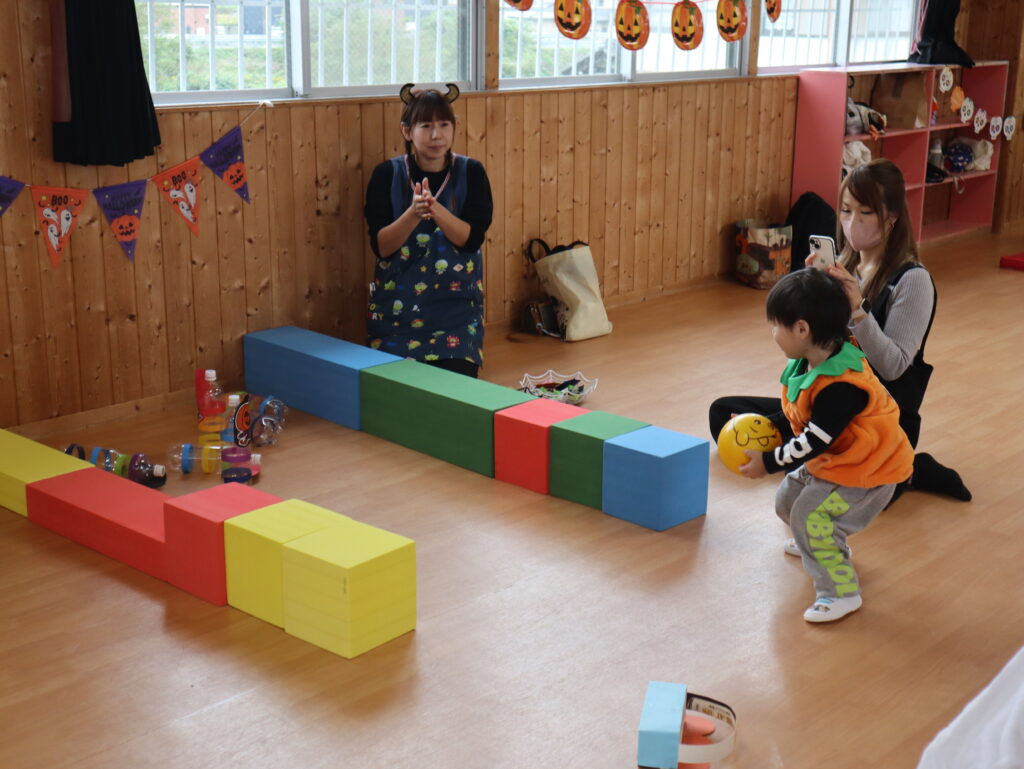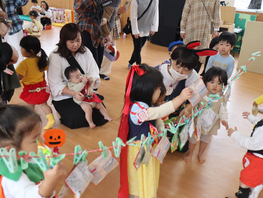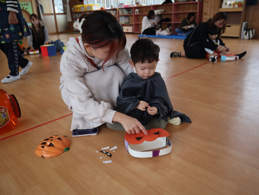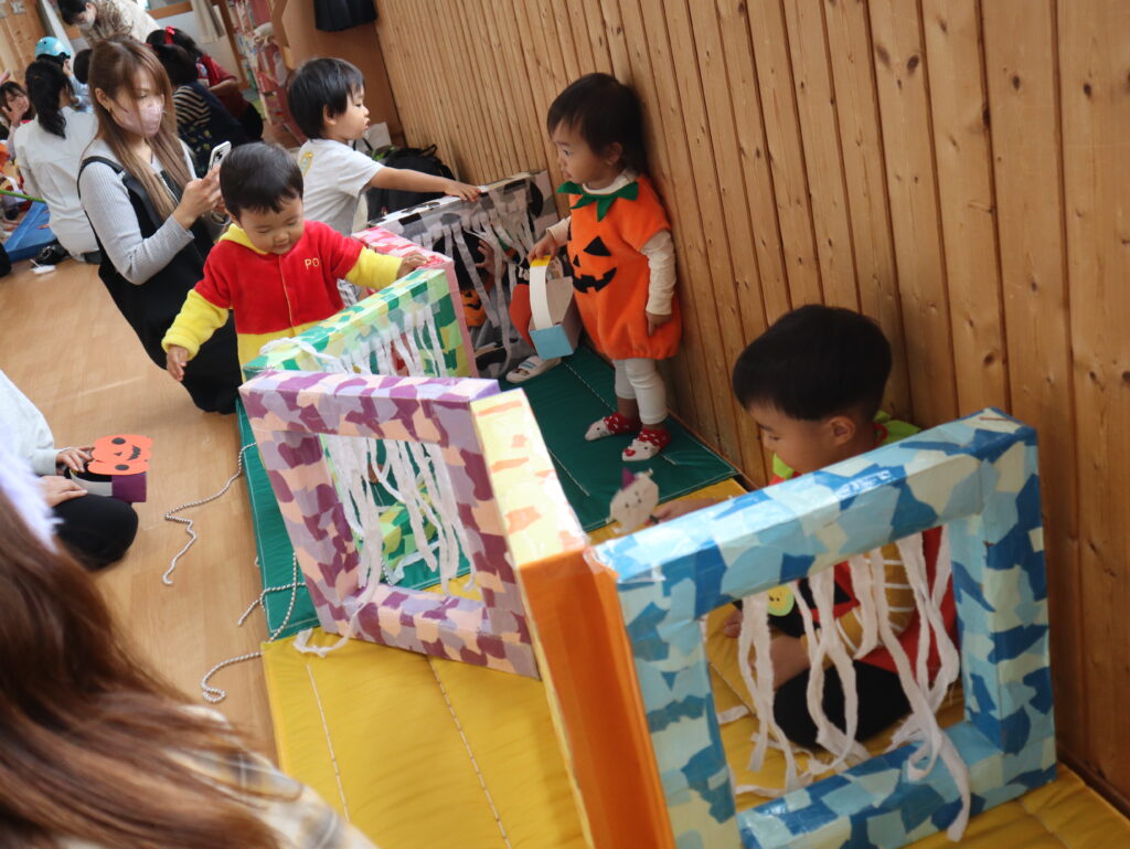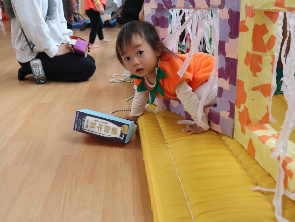朝の会から始まり出席調べ誕生会を行い、その後ハロウィンの由来を聞きかぼちゃの入れ物づくりをしました。入れ物が出来ると、パーティーの始まりです。‘目玉すくい‘、ハロウィングッズ釣り、蜘蛛の巣くぐり、ハロウィンボーリング、フォトスポットで遊びました。ブースごとにキャンディー、スティック、コマ、ハロウィンイラストをお土産にもらいました。仮装での参加とても可愛かったです。