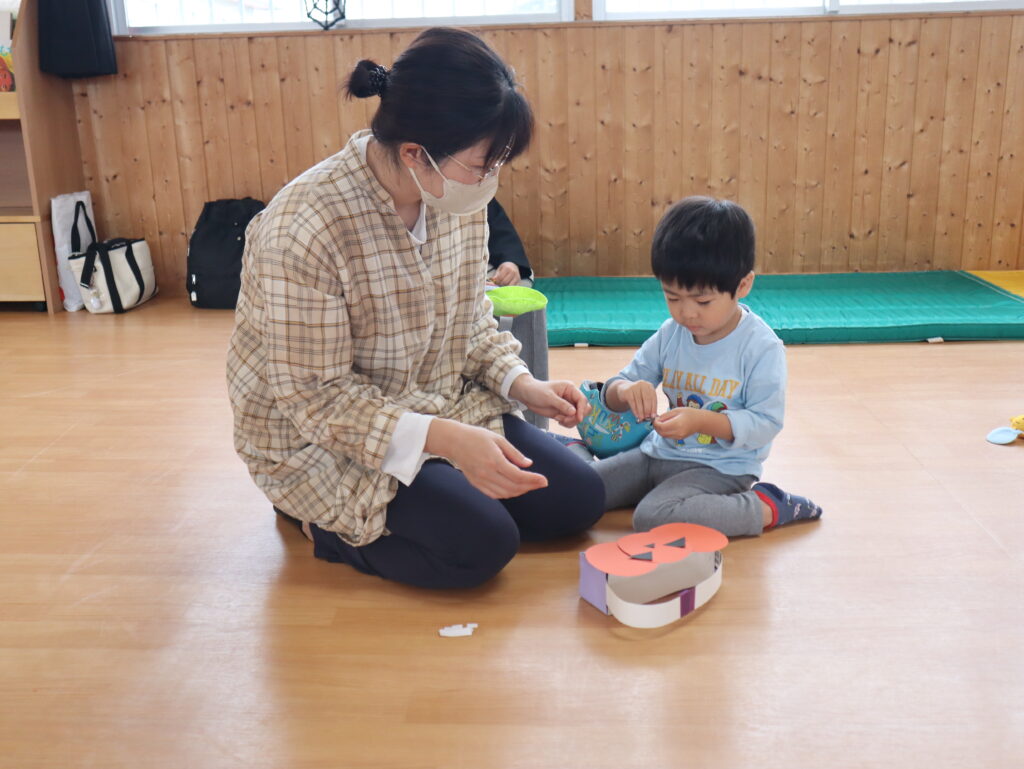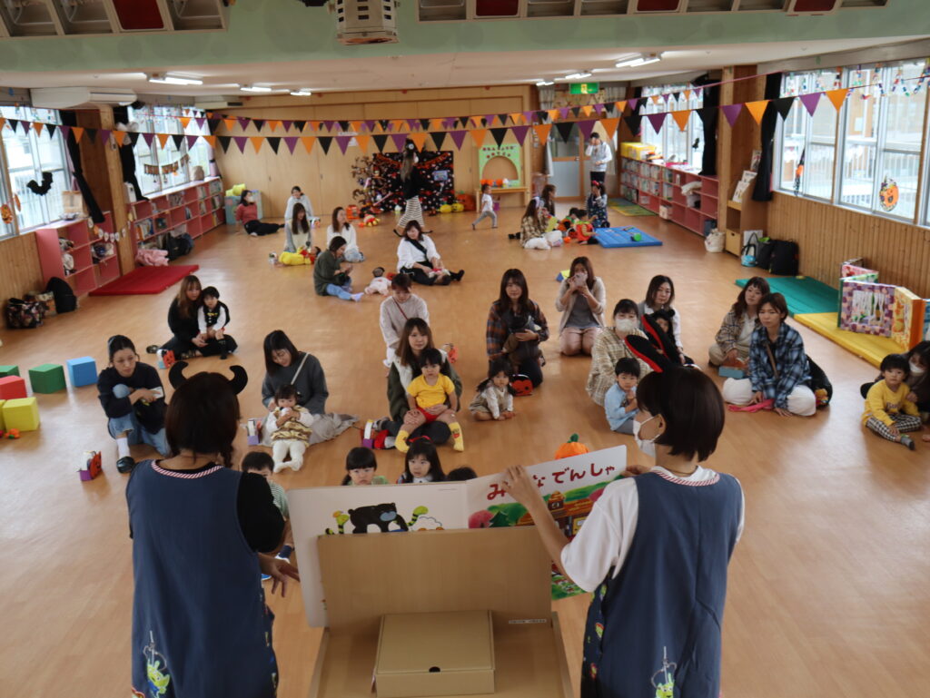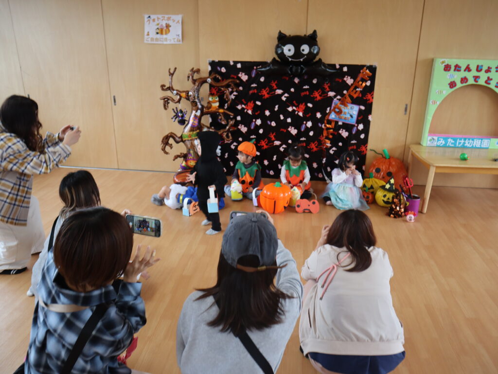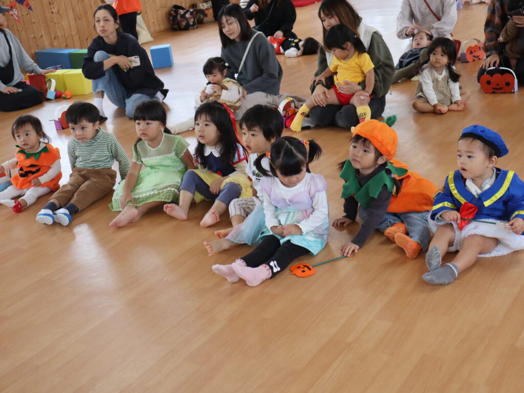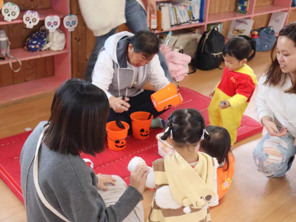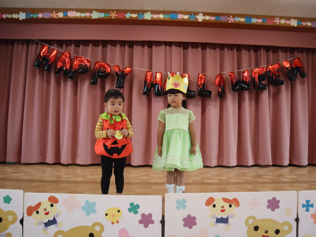 朝の会から始まり出席調べ誕生会を行い、その後ハロウィンの由来を聞きかぼちゃの入れ物づくりをしました。入れ物が出来ると、パーティーの始まりです。‘目玉すくい‘、ハロウィングッズ釣り、蜘蛛の巣くぐり、ハロウィンボーリング、フォトスポットで遊びました。ブースごとにキャンディー、スティック、コマ、ハロウィンイラストをお土産にもらいました。仮装での参加とても可愛かったです。