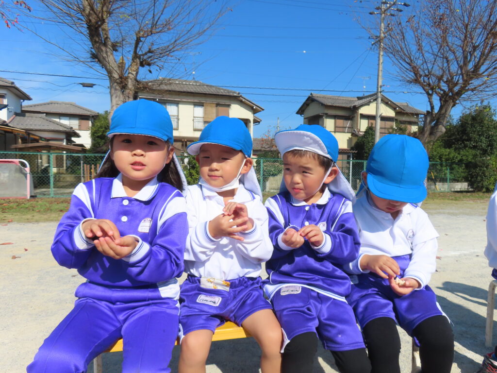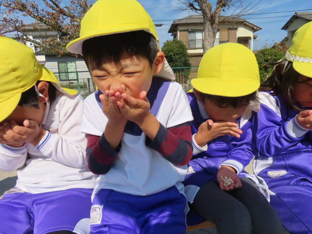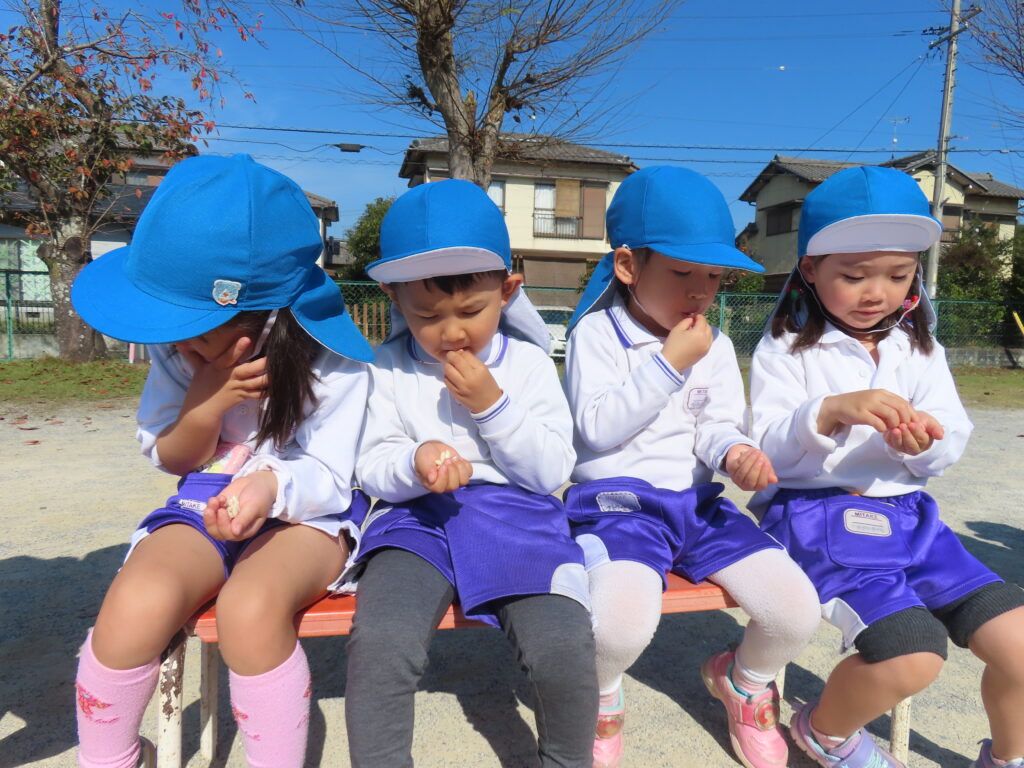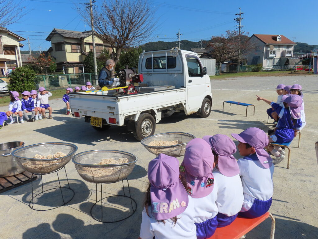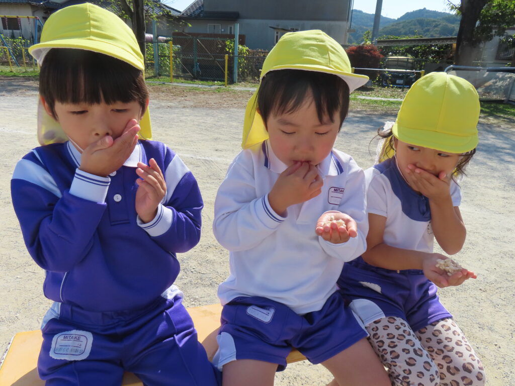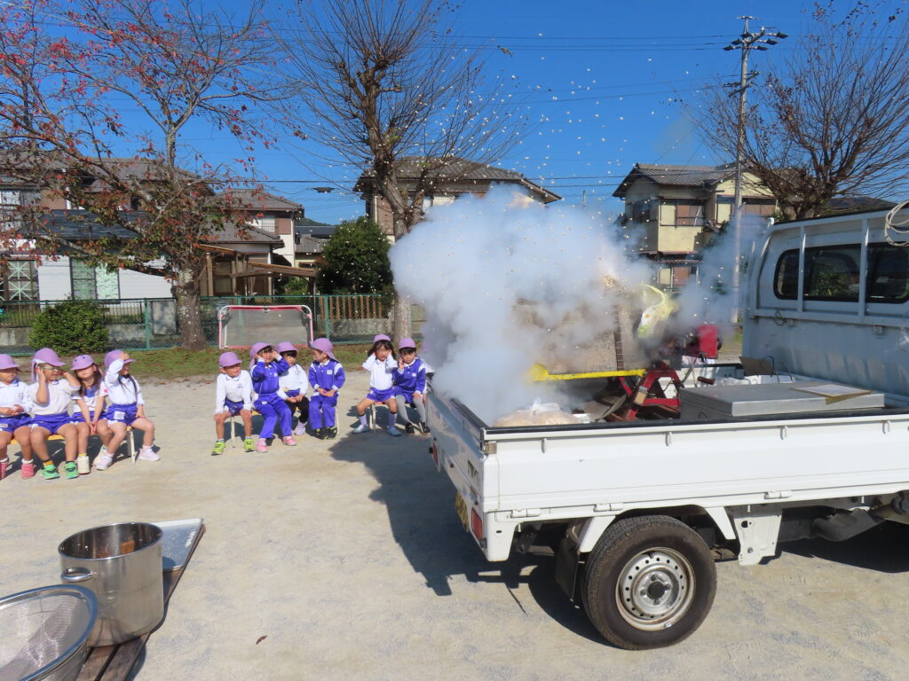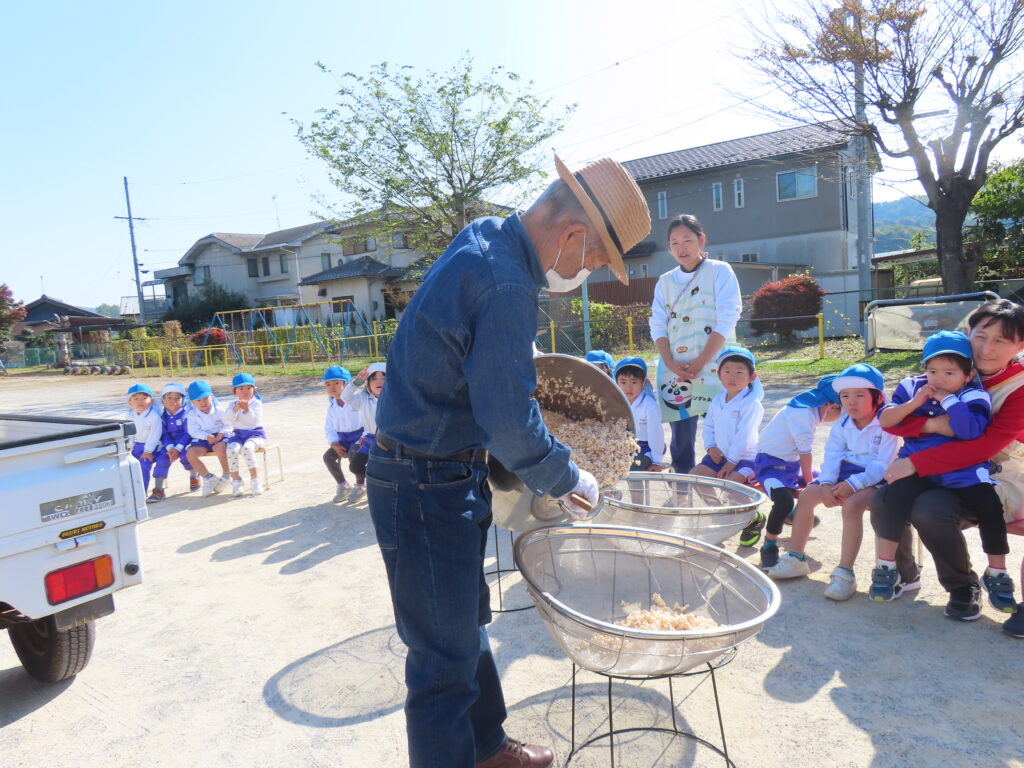 11月7日(金)に年長さんの育てたお米でポン菓子が出来る手順を目の前で見て、出来立てのポン菓子をいただきました。園庭に響き渡る大きな音の後にはお米のいい香りがして「おいしいにおいがするね」「これ、お土産で持って帰れるかな~」っと子どもたちのワクワクした声が聞こえてきました。出来立てのポン菓子を口に入れ「もっとたべたいよ~!」と嬉しそうにほおばる姿はとっても可愛かったです。