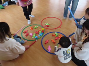楽しかった大鍋会を振り返りながら、豚汁のはじき絵を描きました。まず初めにお椀の形に切ってある画用紙に具材を描いていきました。“にんじん、だいこん、さつまいも、とうふ“を思い浮かべながら「おとうふは白いから白で描こう」なんて色もよく考えて描く姿がみられました。「あれ?しるがなぁ~い!!」っと汁がないことに気付く子も!絵の具で汁を描くと具材がはじき出されて「うわぁ~すごいね~」と驚きながら楽しそうに描きました。