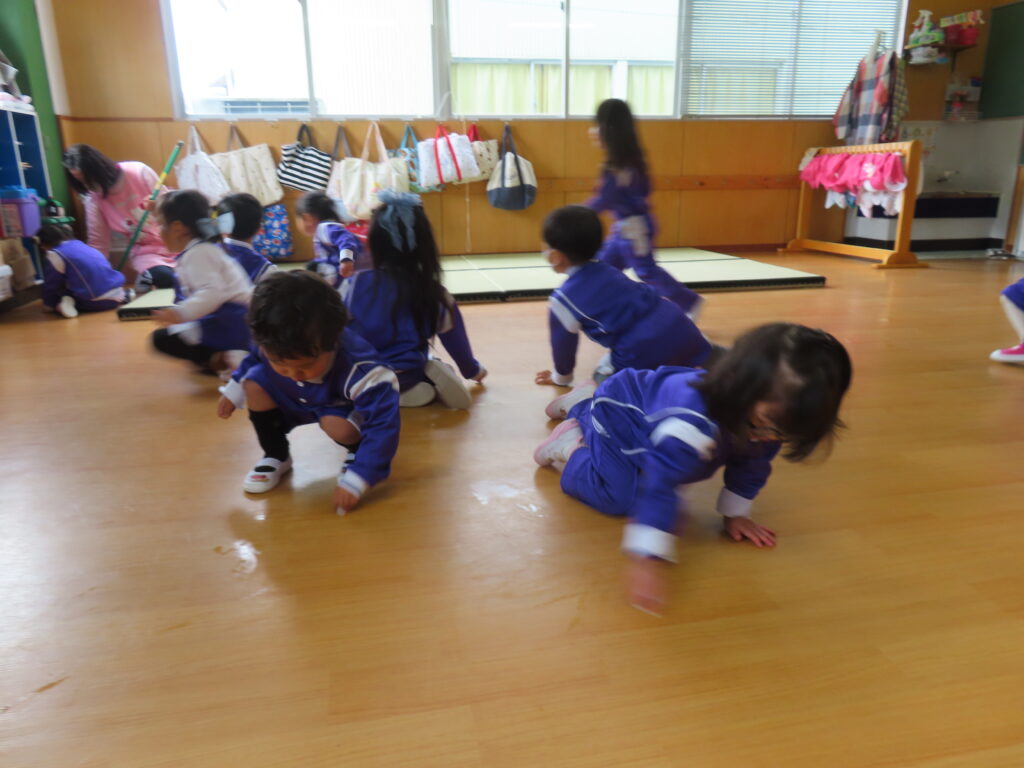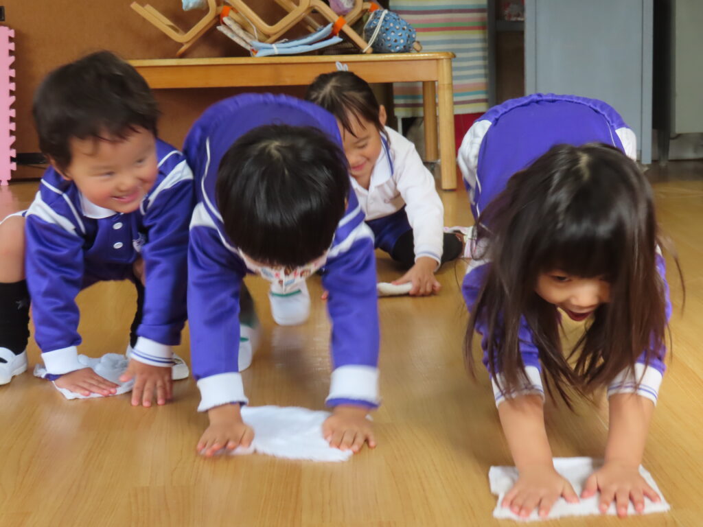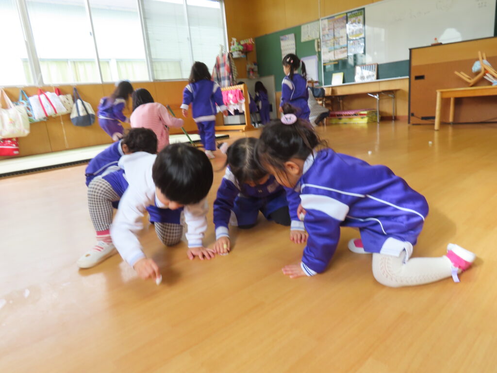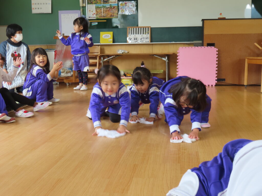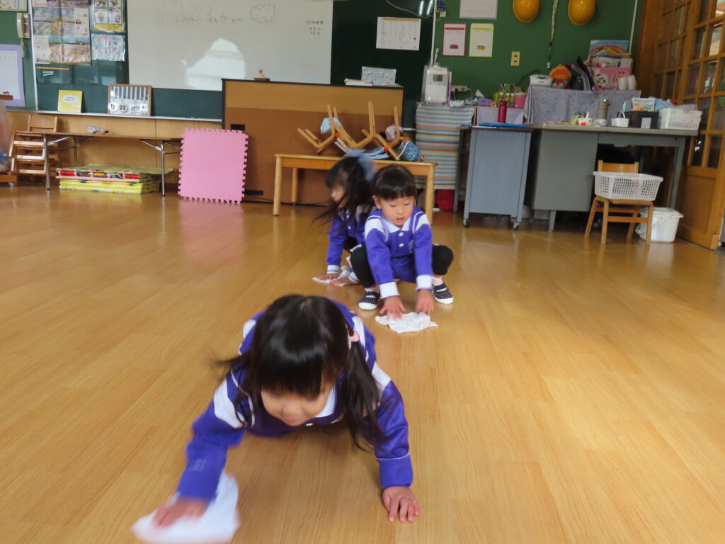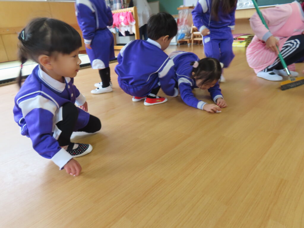 つくし組みんなで気持ち良く新しい年を迎えられるよう、雑巾とスポンジを使ってお掃除をしました。床の汚れを自分たちで見つけながらスポンジでゴシゴシした後、雑巾がけを4人ずつになってかけました。雑巾がけをしているお友だちを待っている子たちは自然と「がんばれがんばれ」と声を出し応援してました。みんなのおかげでピッカピッカになりました。
