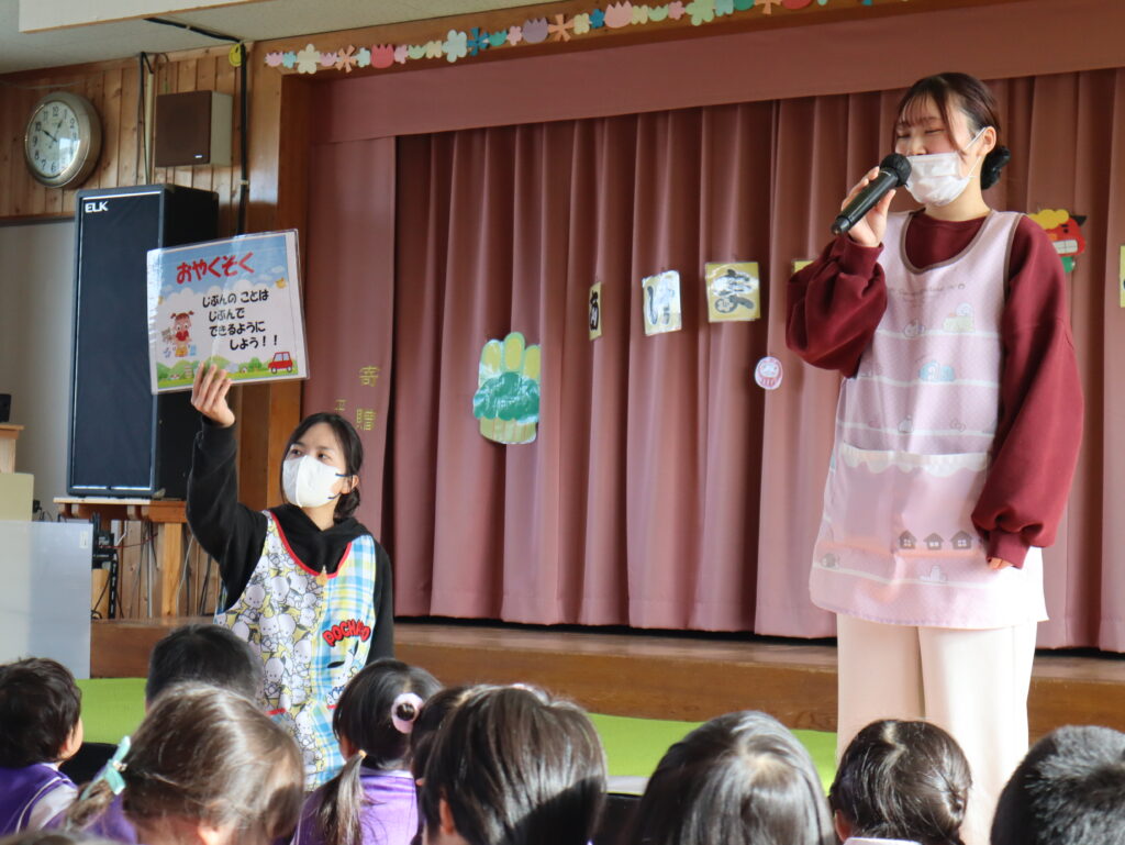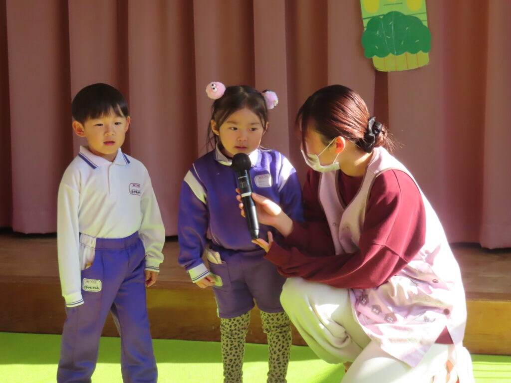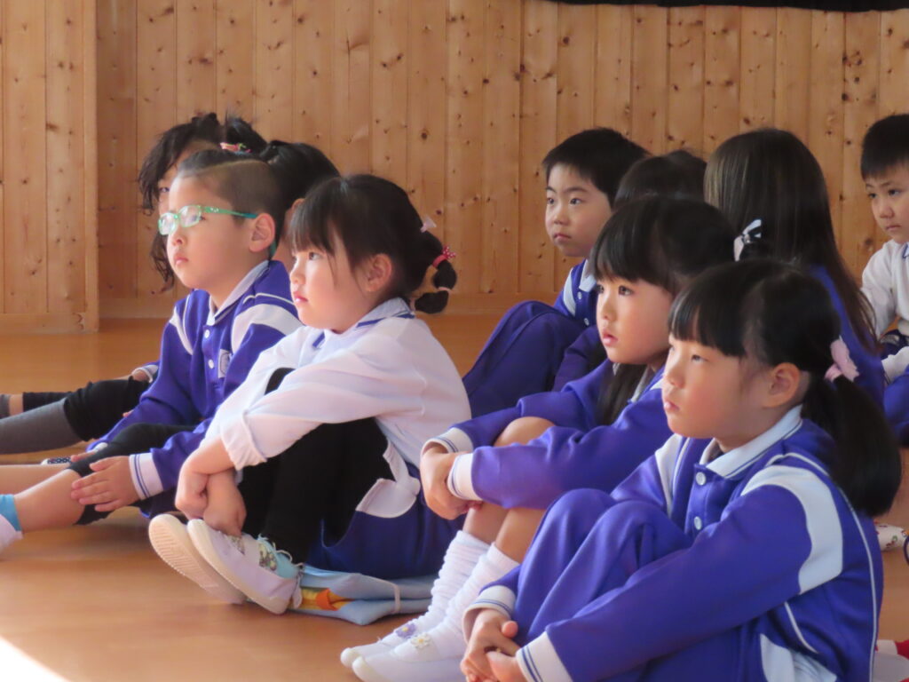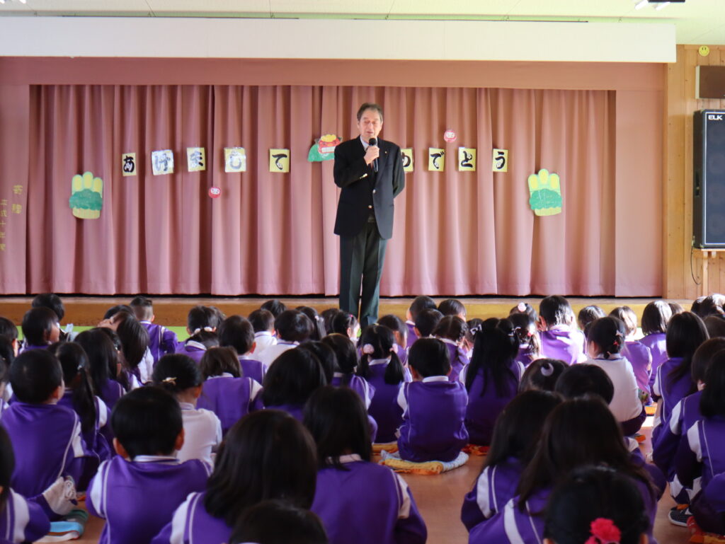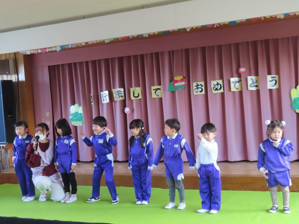 新年あけましておめでとうございます。長いお休みから元気に登園した子ども達、幼稚園には笑顔あふれる日常が戻ってきました。今日は始業式でした。園長先生のお話を聞き、冬休みの思い出を代表の子が前に出て発表してくれました。終業式に話した冬休みの約束の確認もしました。守れた子、守れなかった子もいましたが、引き続き規則正しい生活を心がけていきたいですね。