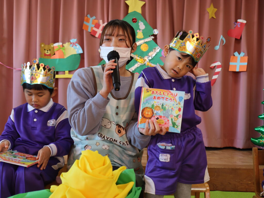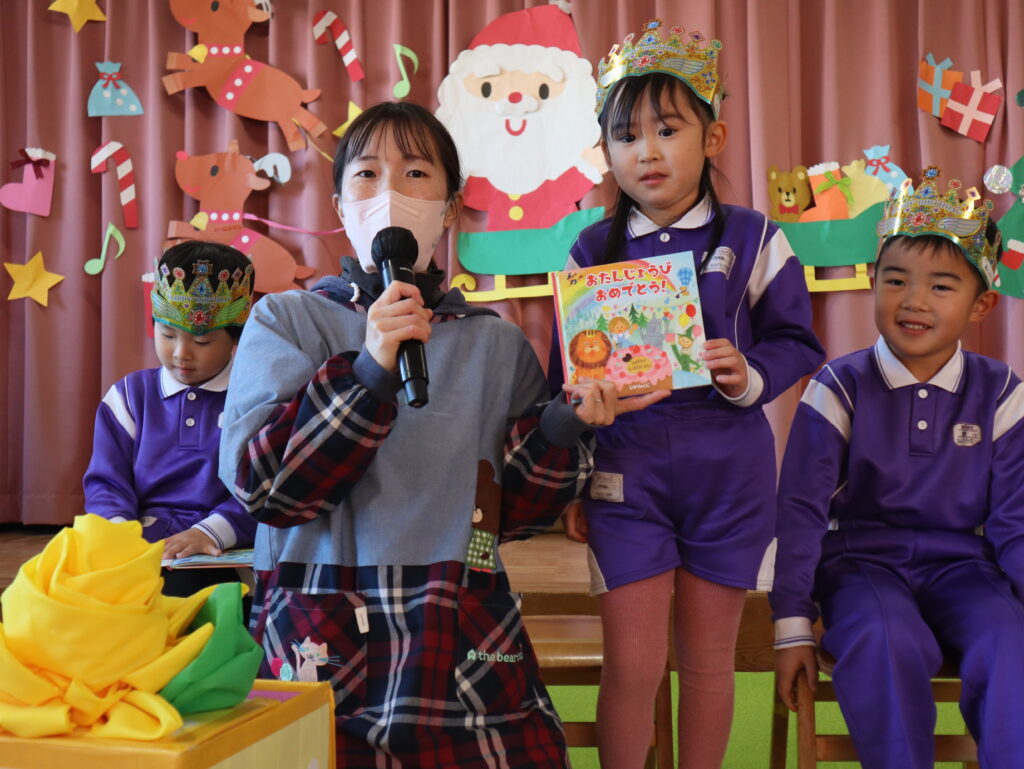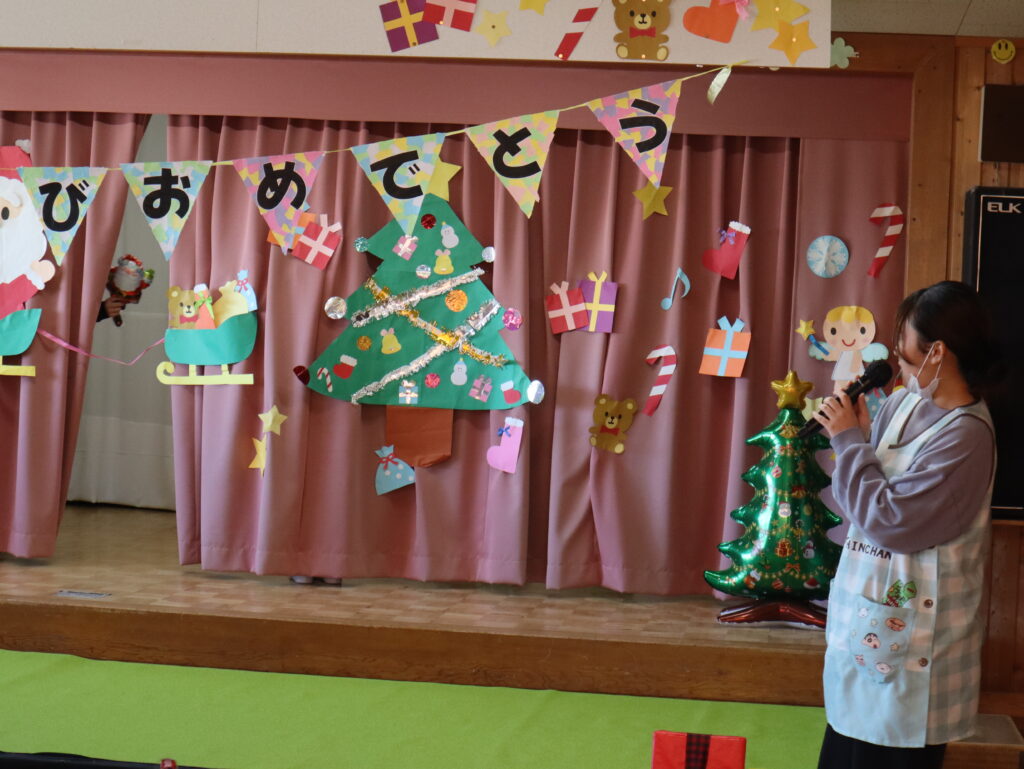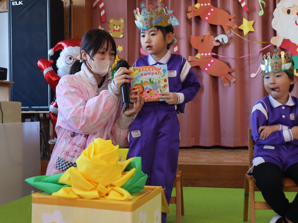 話が前後しますが、12月の誕生会では7名のお友だちのお祝いをしました。先生からのお楽しみは「ものあてゲーム」をしました。クリスマスにちなんだものがカーテンとカーテンの間を飛んで行き子どもたちは身を乗り出しながら答えを導き出し楽しそうに参加していました。