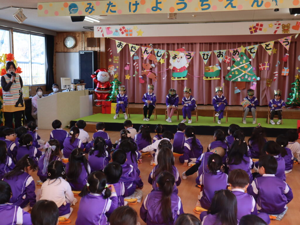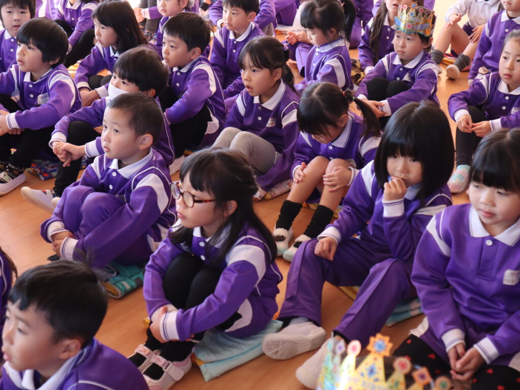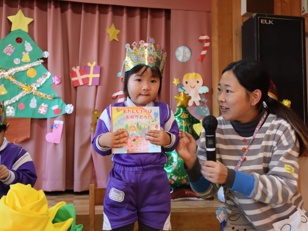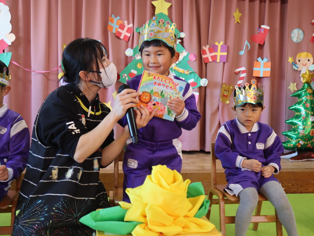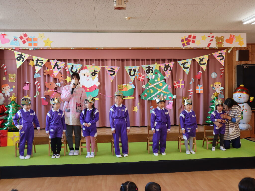 話が前後しますが、12月の誕生会では7名のお友だちのお祝いをしました。先生からのお楽しみは「ものあてゲーム」をしました。クリスマスにちなんだものがカーテンとカーテンの間を飛んで行き子どもたちは身を乗り出しながら答えを導き出し楽しそうに参加していました。