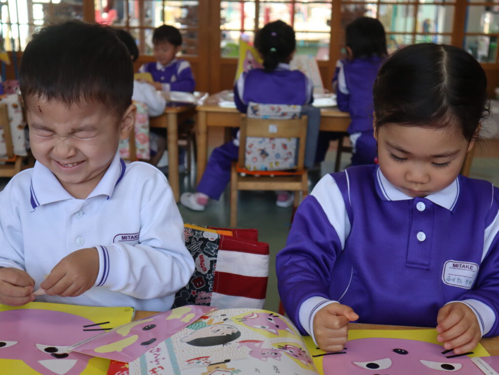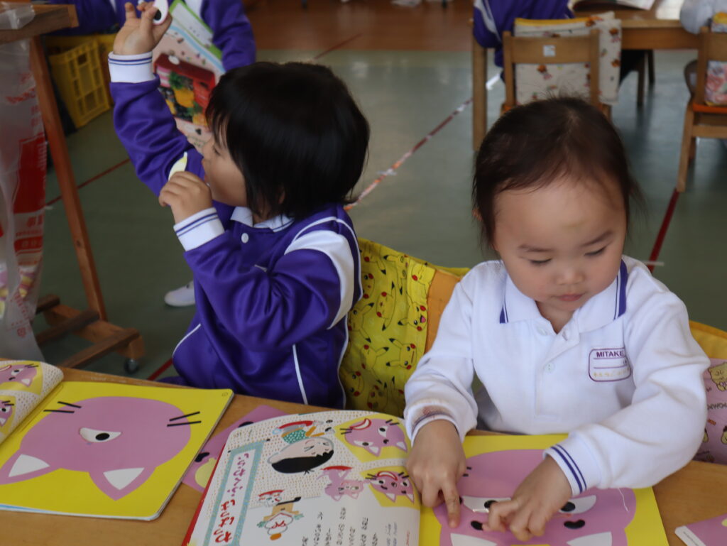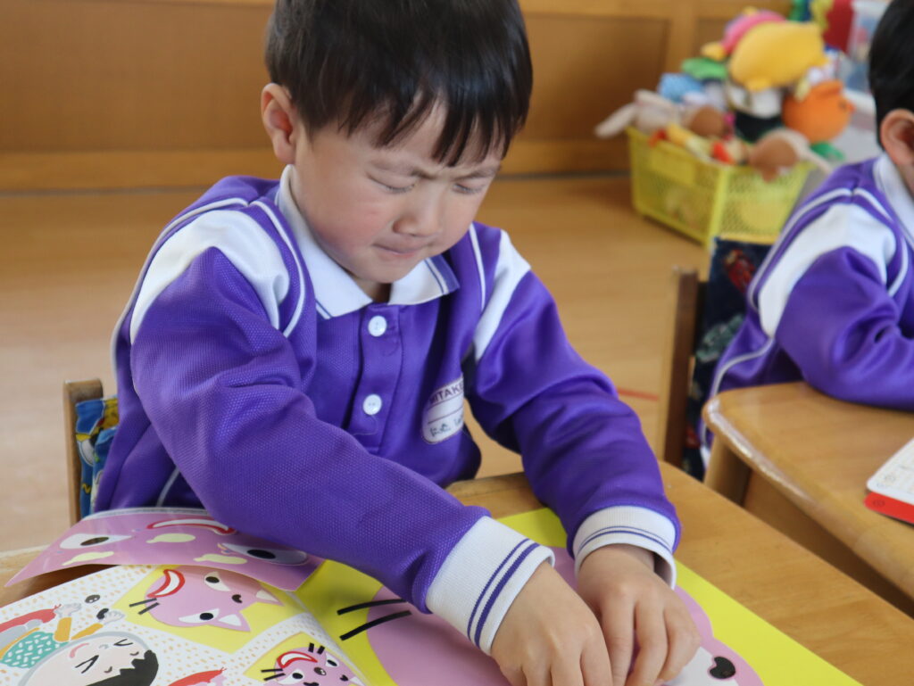 月刊本に載っている福笑いをしました。目をつむって顔のパーツを貼り、完成した顔に大笑い!!お正月ならではのあそびを楽しみました。