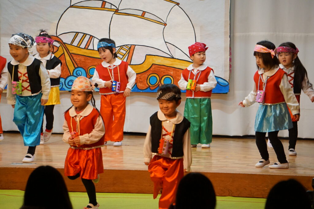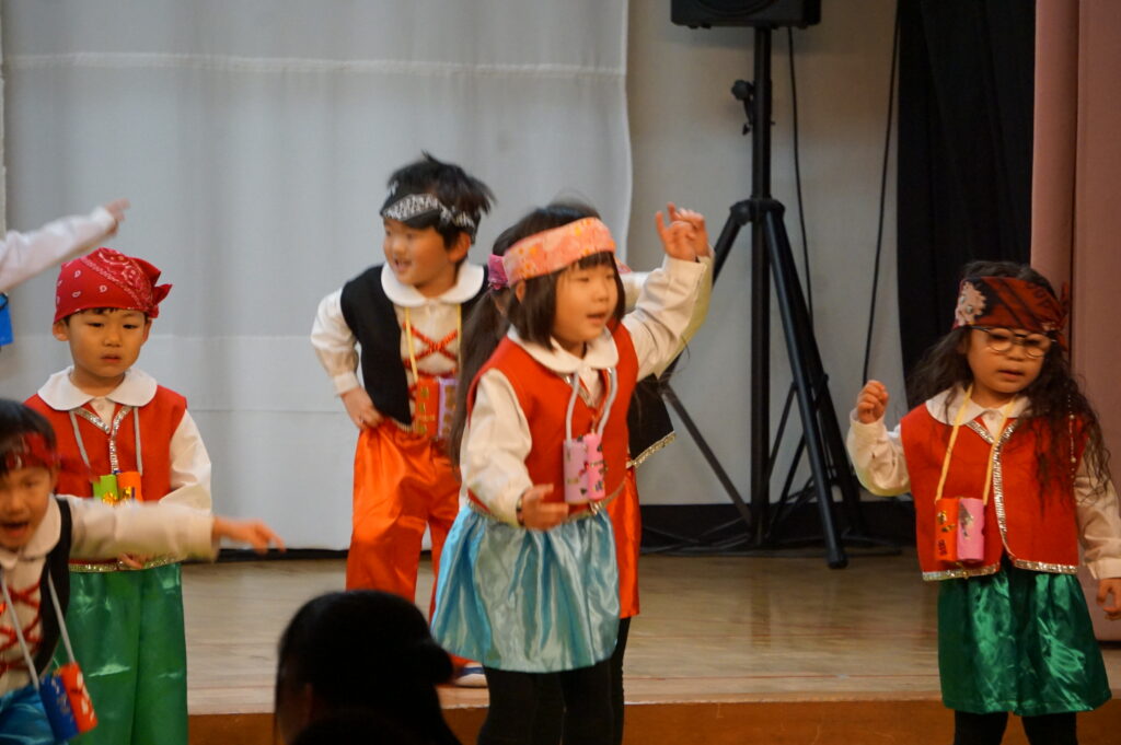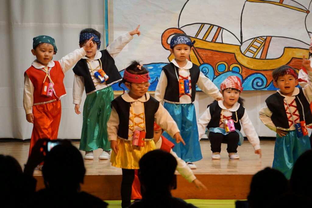 春の発表会(年少組) 2026年2月20日 最終更新日時 : 2026年2月20日 mitakeed 春の発表会二日目を迎えました。年少組「ぼくらは小さな海賊だ!」「ぼよよん行進曲」、可愛い衣装に元気いっぱいの曲に合わせて笑顔いっぱいにお遊戯を楽しみました。