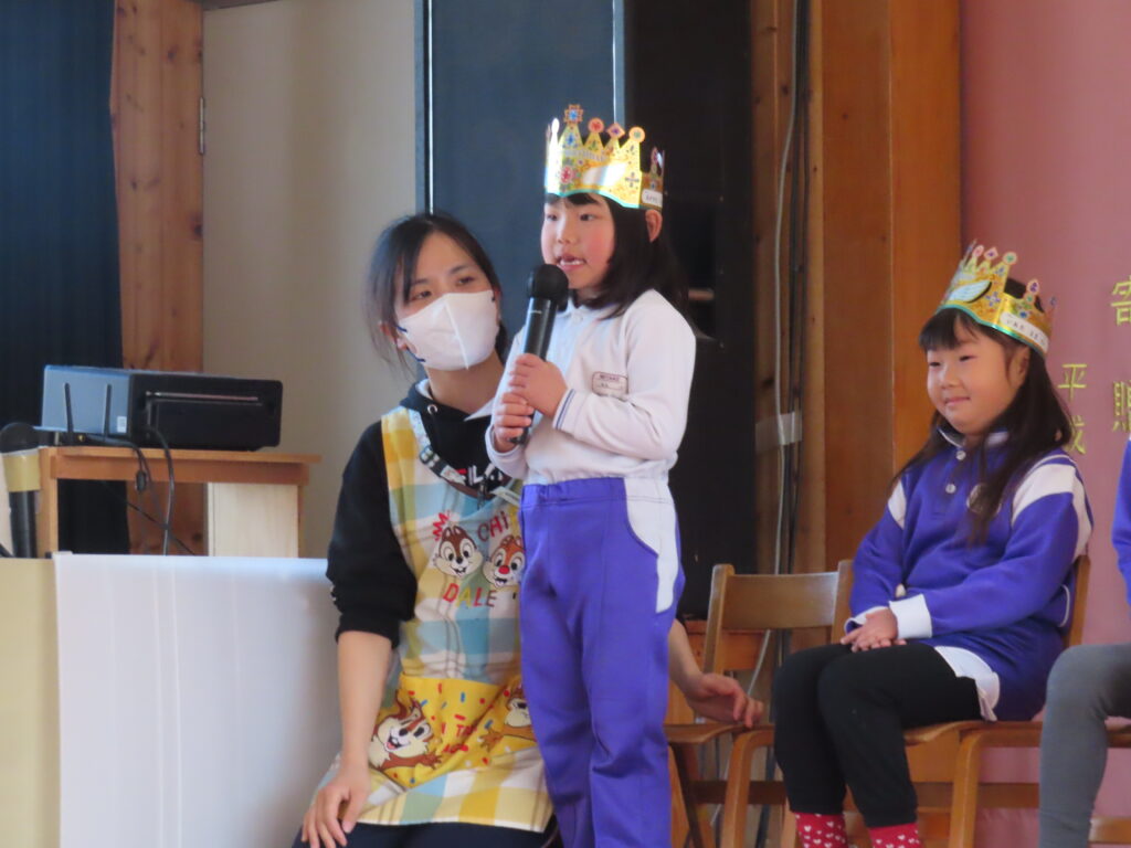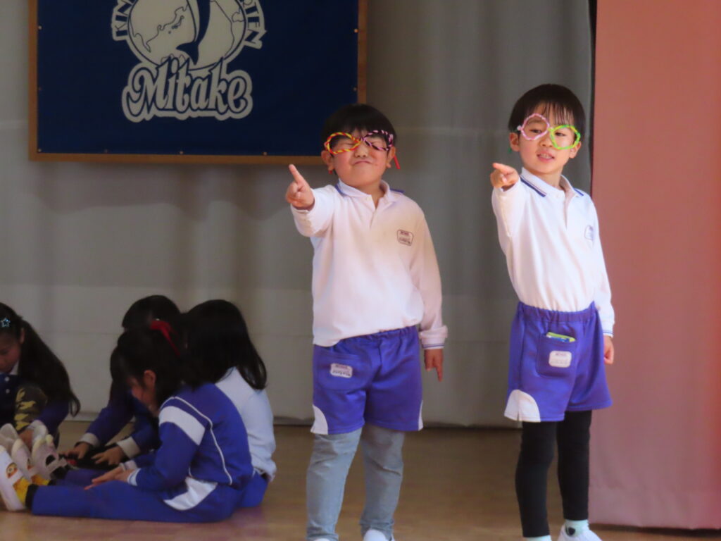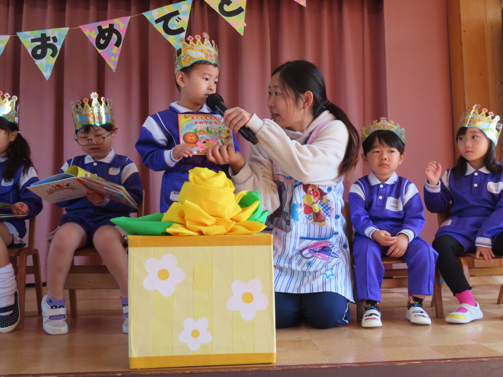 3月生まれの誕生会を3月上旬に行いました。お楽しみは年長児ばら組による「おばけのがっこうへきてください」の劇発表を観ました。楽しそうに演じる年長さん!!みんなもしっかり最後まで集中してみていました。