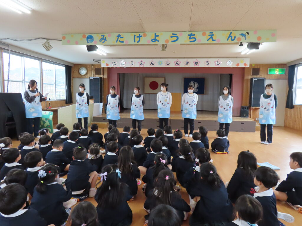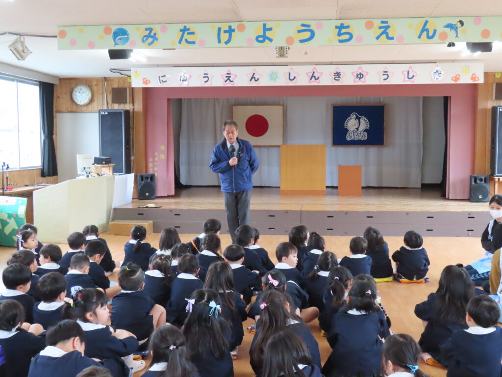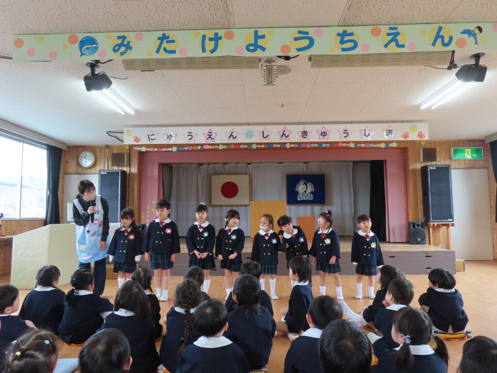 進級式を行いました。園長先生のお話を聞き,先生紹介、クラスから代表で2名づつ春休みの楽しかったことを発表してもらいました。「春休みはママと一緒におままごとしたことが楽しかったよ」「桜の花見に行ったのが楽しかったよ」など話してくれました。今日から新年度がスタートしました。今年度も職員一同より丁寧な保育を心がけていきたいと思っております。どうぞよろしくお願いいたします。