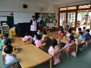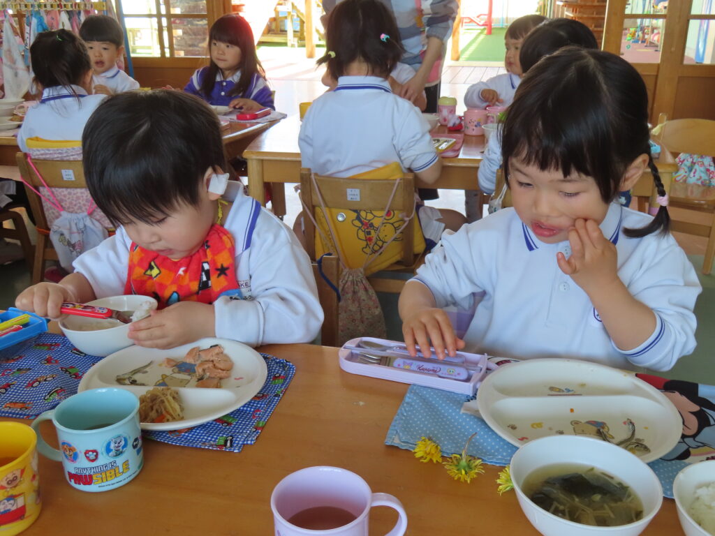 今週から給食が始まりました。「おなかすいたね~」と給食の時間を待ちわびる姿も!「おいしいね」と、楽しい雰囲気の中給食時間を楽しんでいます。