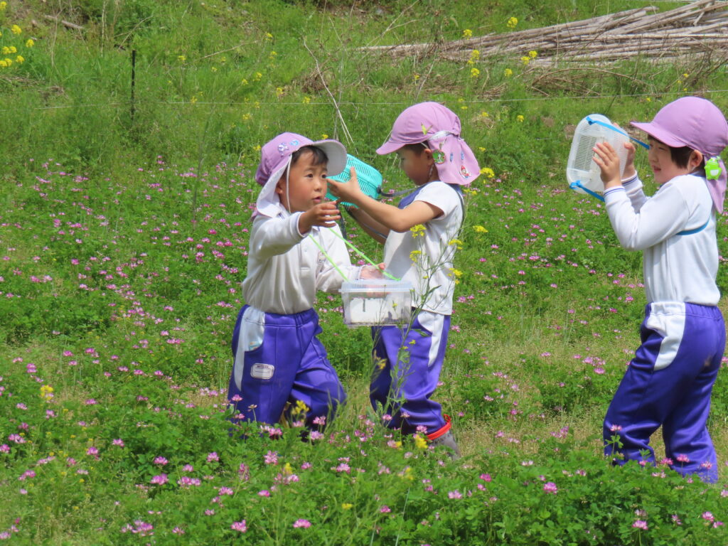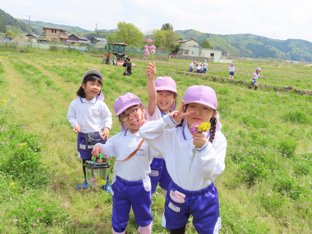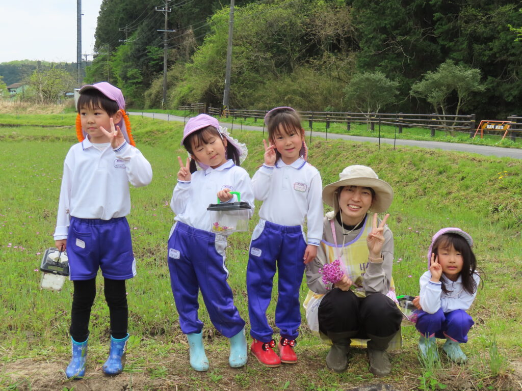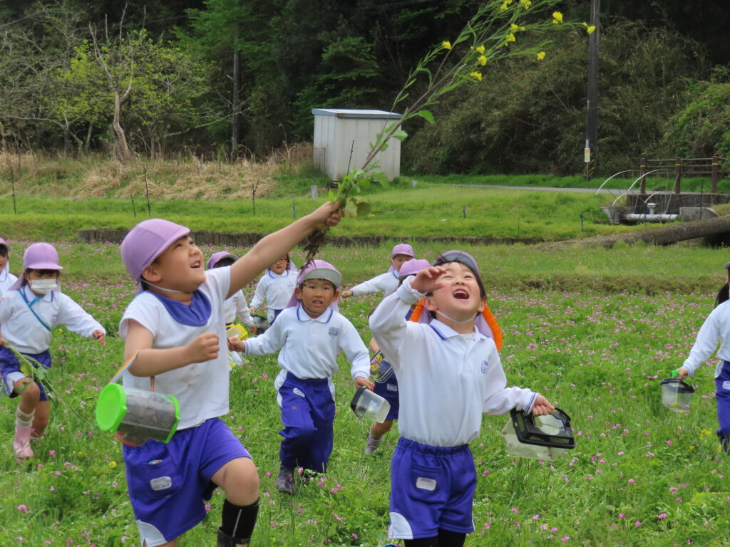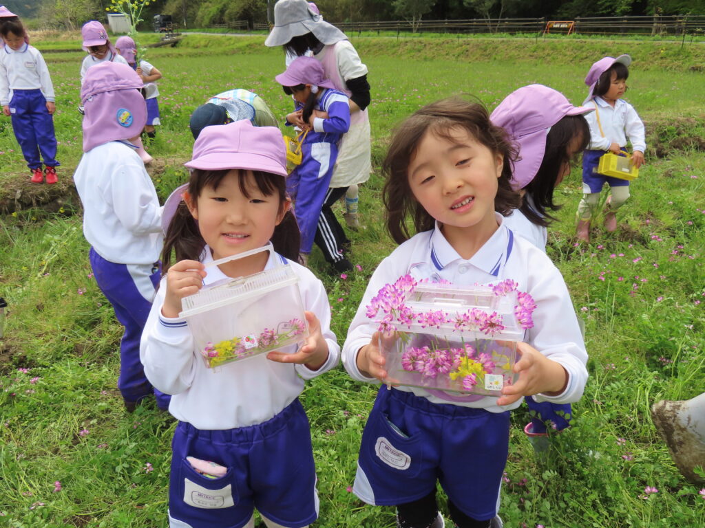 4月17日(金)園バスに乗って御嵩町の送木まで春見つけに行きました。青木さんのご厚意で広~いレンゲ畑で遊ばせていただきました。田んぼの中を思いっきり駆け回り、花のにおいの中花摘みを楽しみ、虫探しをしたり春を沢山見つけることが出来ました♪