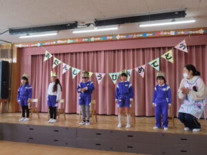 2月26日(木)に2月生まれのお友だち5名の誕生会を行いました。堂々とステージに立ちおおきくなったら何になりたいかを話してくれました。お楽しみは春の発表会のひまわり組の劇をみんなで見てお祝いしました。