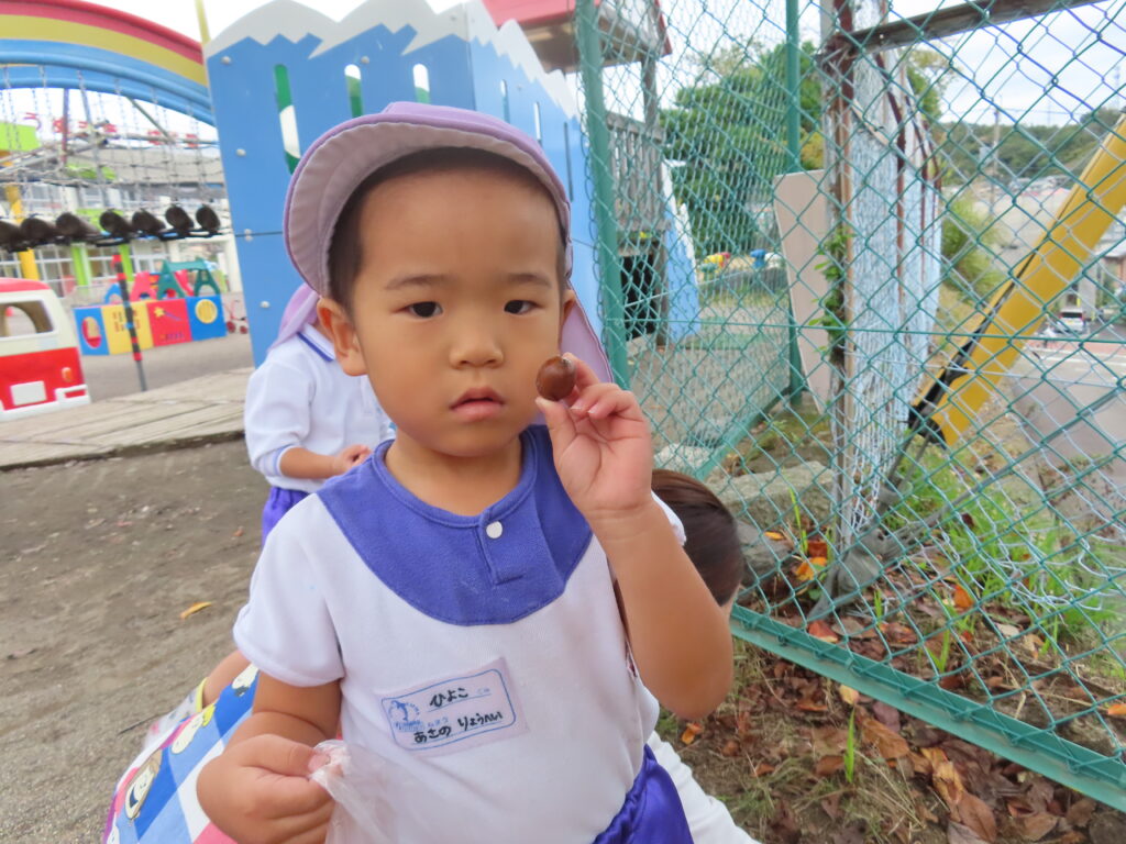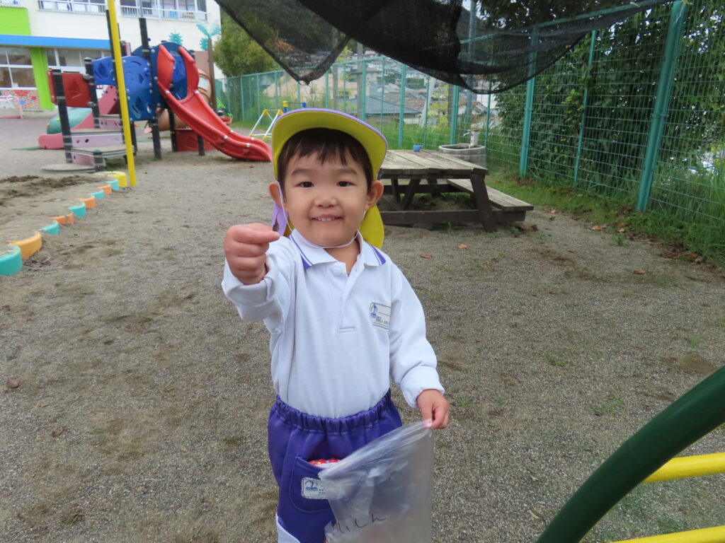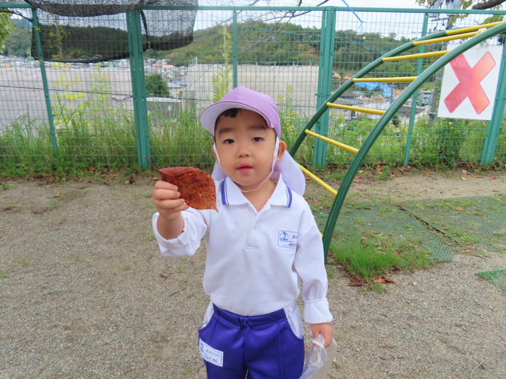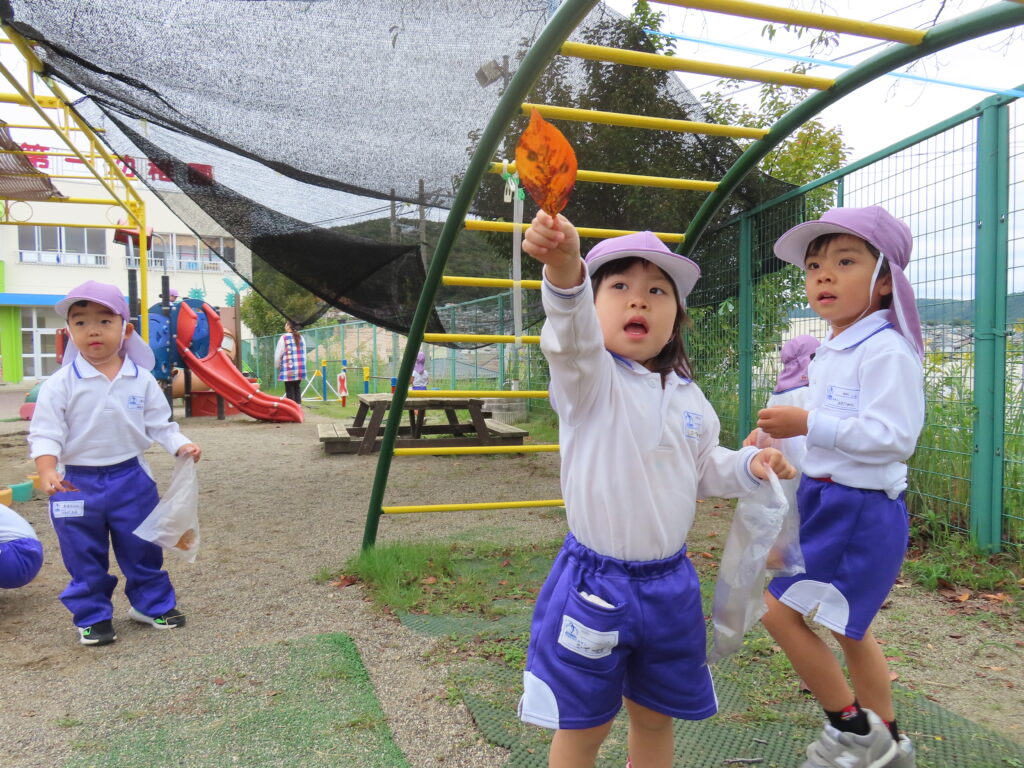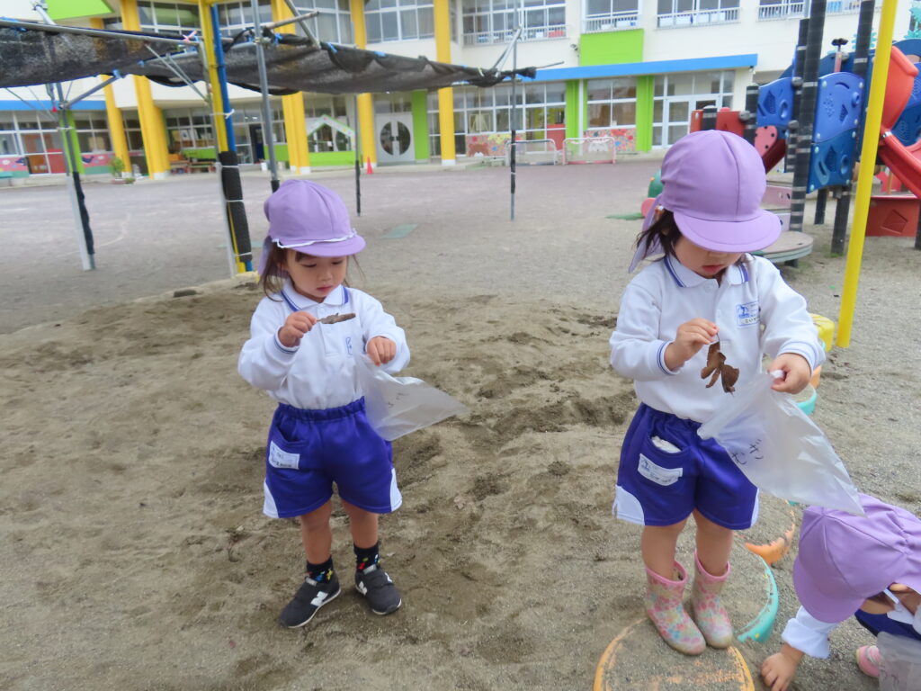 園庭で秋見つけをしました。様々な色の落ち葉を見つけることができました。