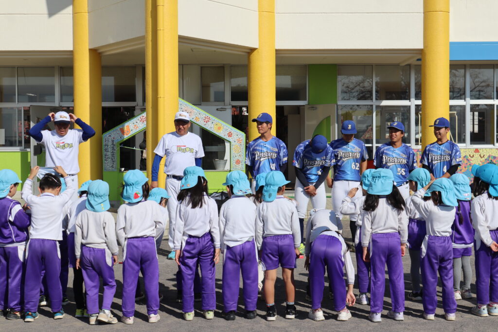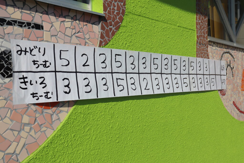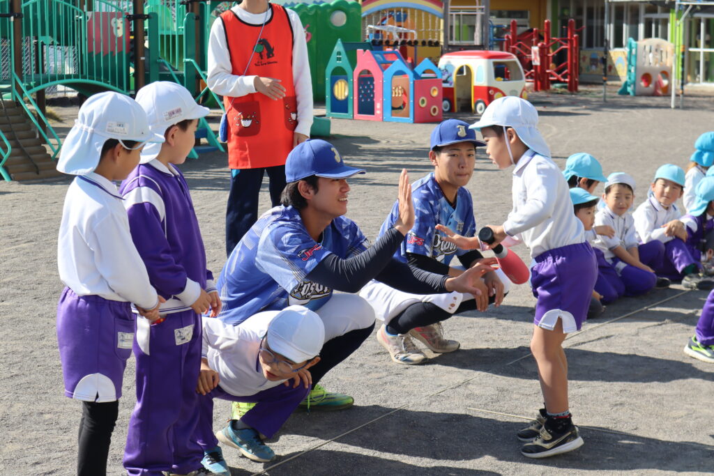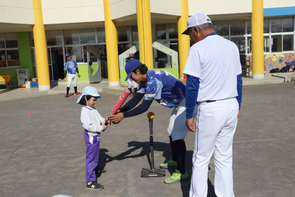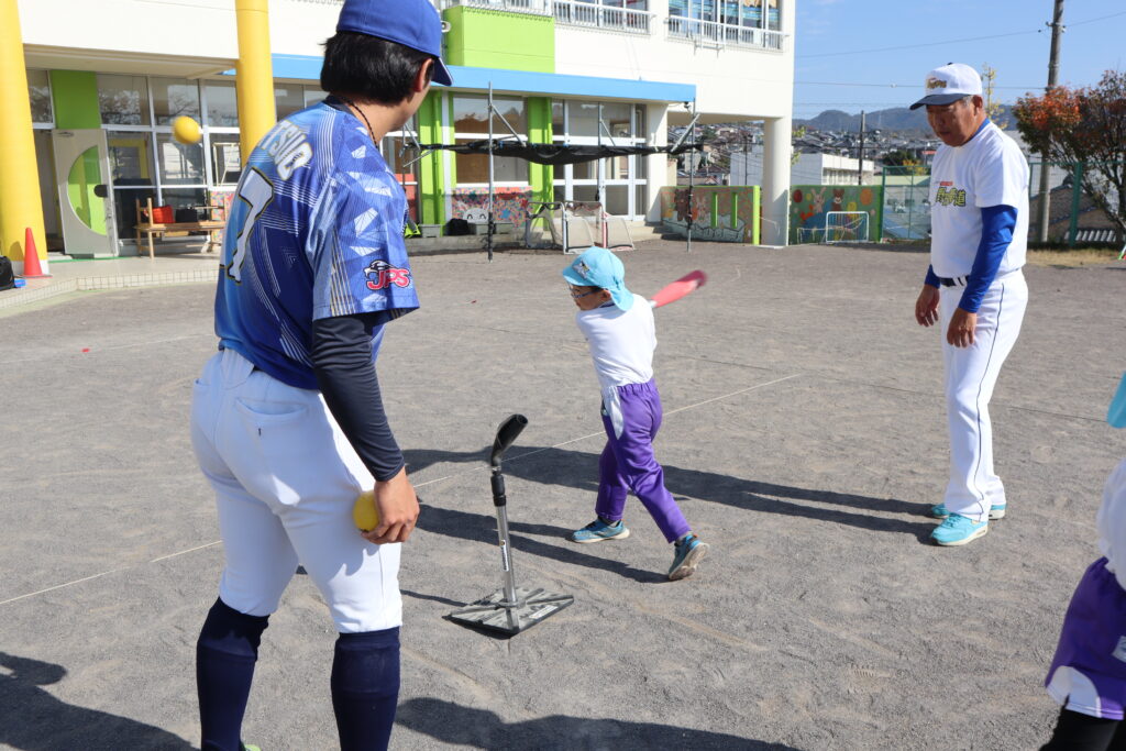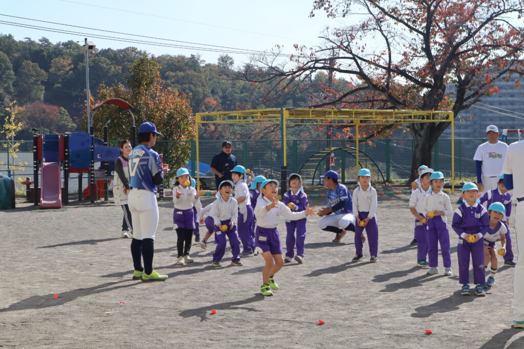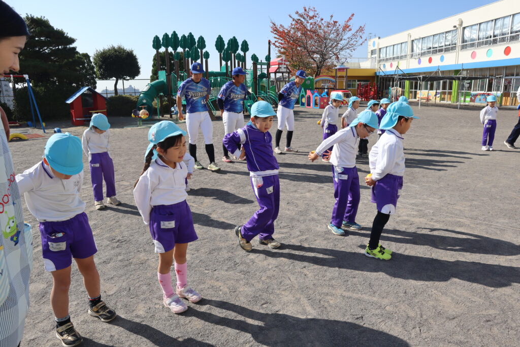 くま組のお友だちが野球教室に参加しました。元野球選手の方がコーチに見え、ボールを使って準備体操を行ったりバットの使い方など教えてもらいました。バットを構えてから、ボールをよく見て打つ!「カキーン!!」上手に打つことができていました。最後は2チームに分かれ、ボールがどこまで飛ぶかで点数を決め試合もしました。どのチームが勝ったかな??お子様に聞いてみてください。
