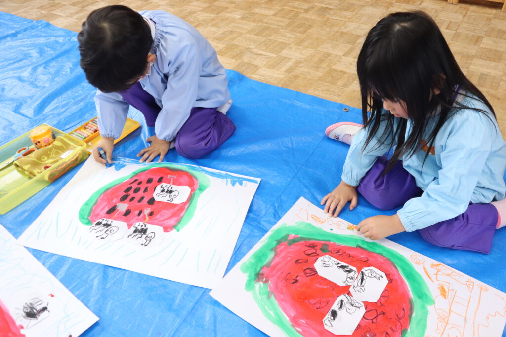 絵画あそび 年中組 2025年11月25日 最終更新日時 : 2025年12月4日 unuma1ed 今回のテーマはおはなしの絵。「ありとすいか」の絵本を見て描きました。絵の具ですいかやありの絵を描き、はさみも使って自由に絵本の世界を表現しました。