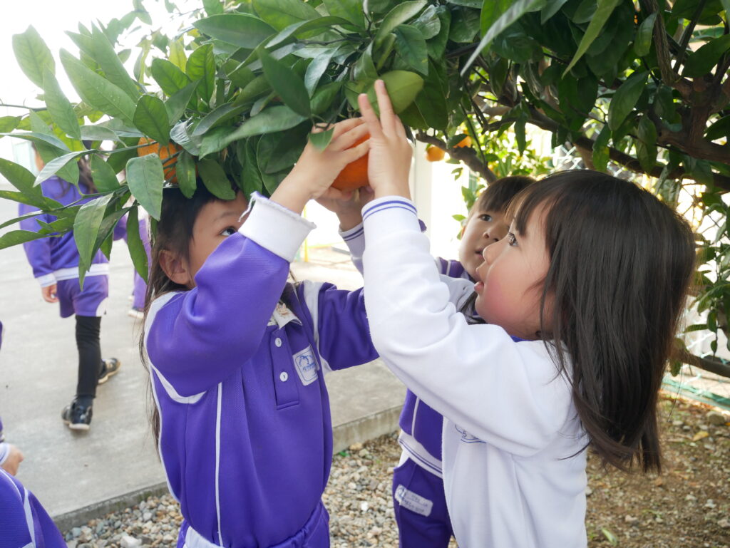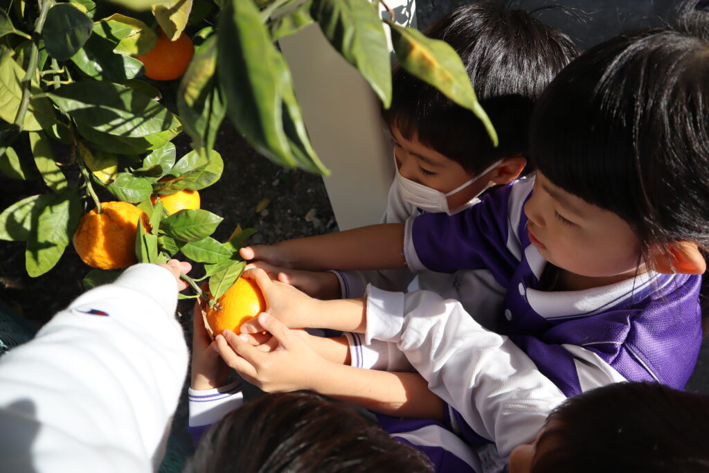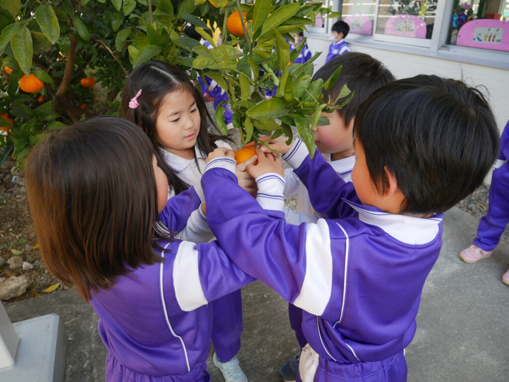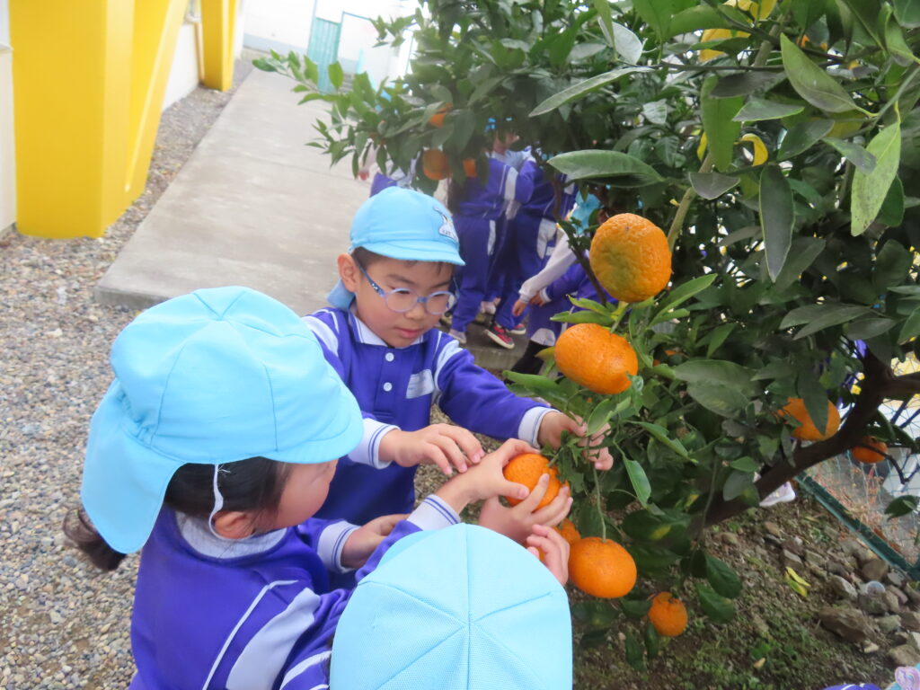 幼稚園のみかんの木にたくさんのみかんが実りました。みんなで収穫をしていただきました。