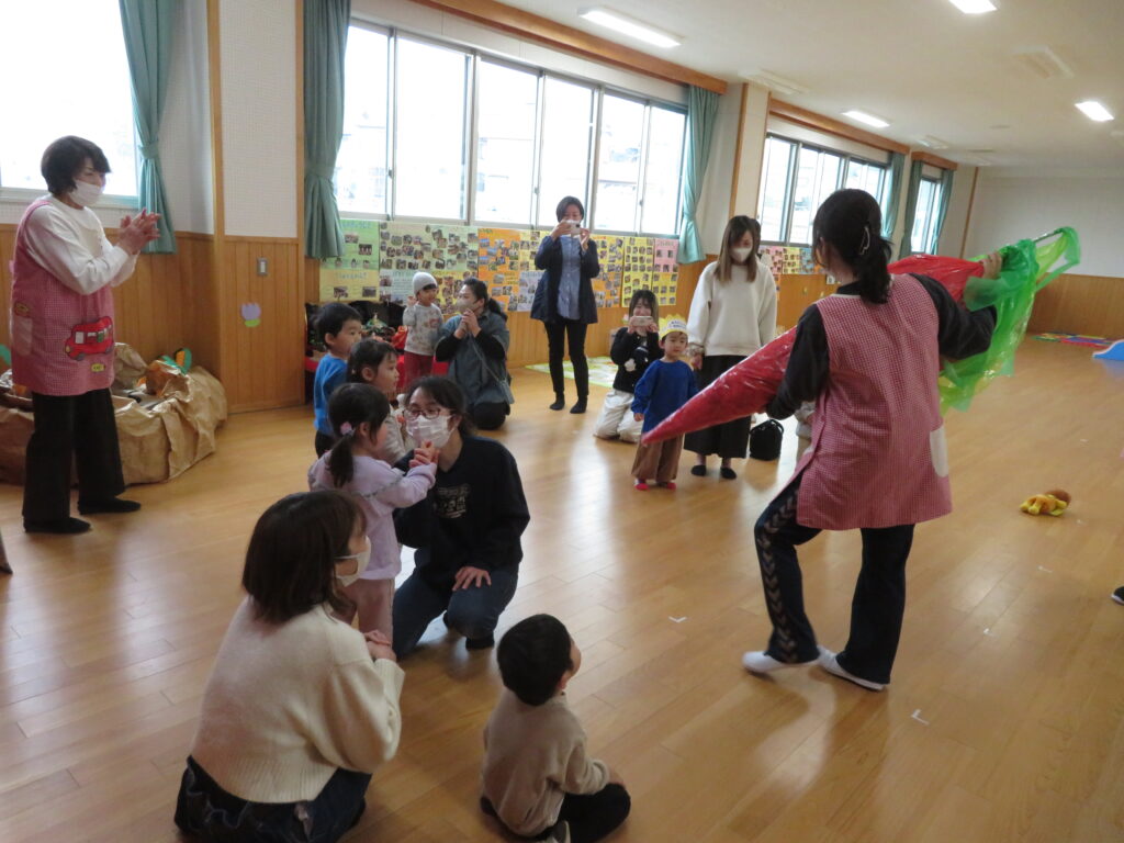 役になりきって楽しむ年少さんの劇を見せてもらいました。