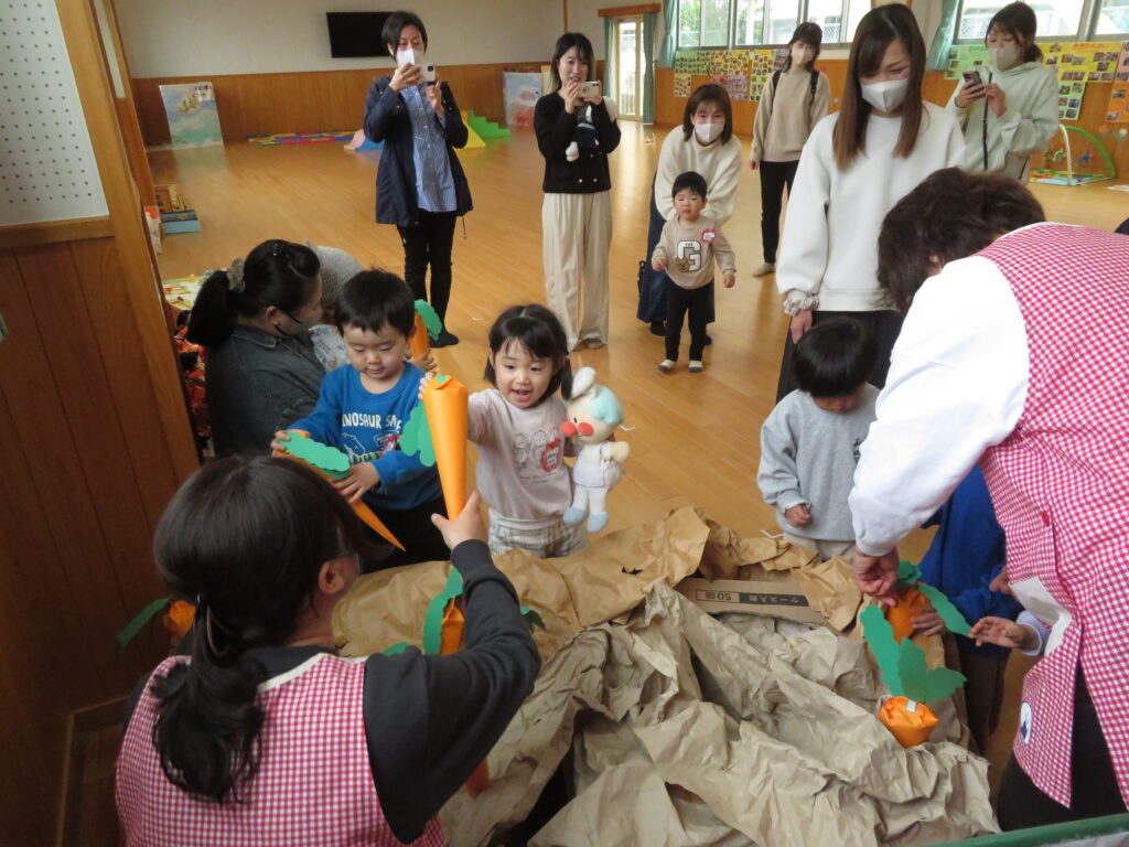 大きなかぶの絵本を見ていたら、みんなの前にも大きなにんじんが!!みんなでよいしょ!よいしょ!