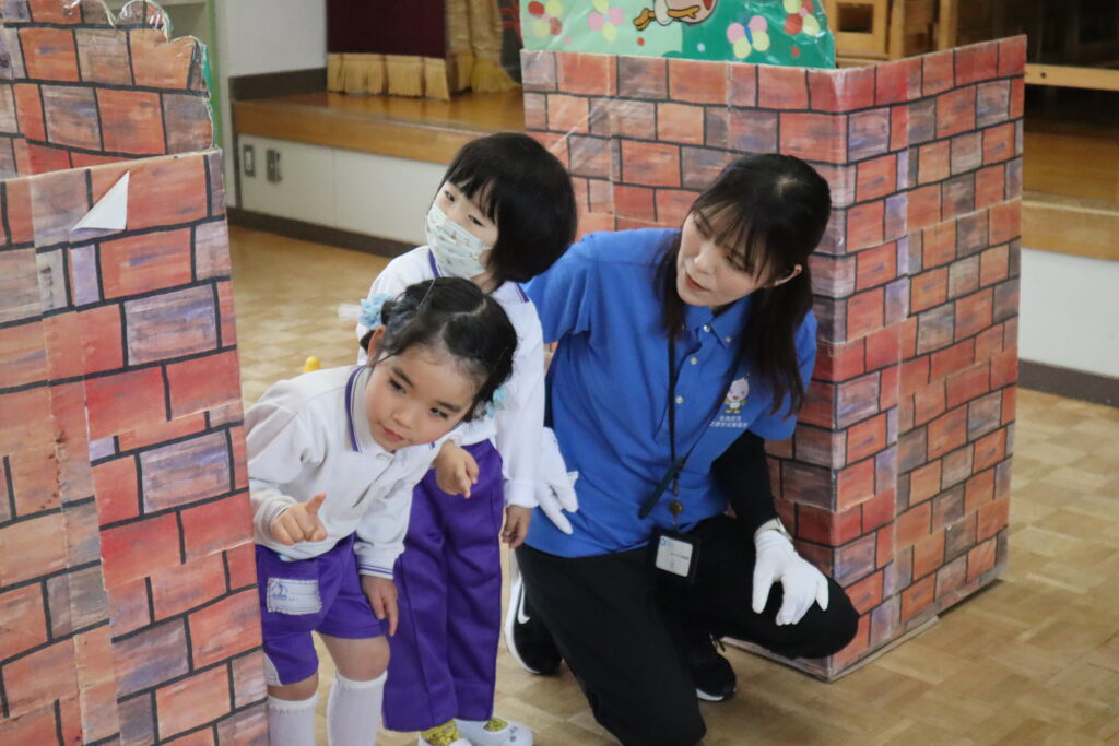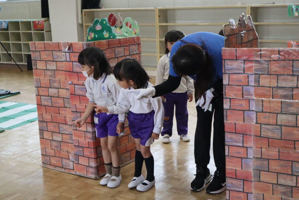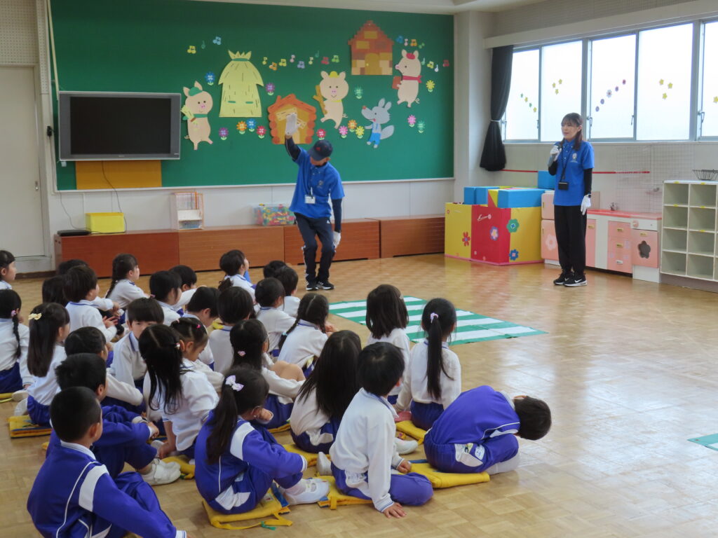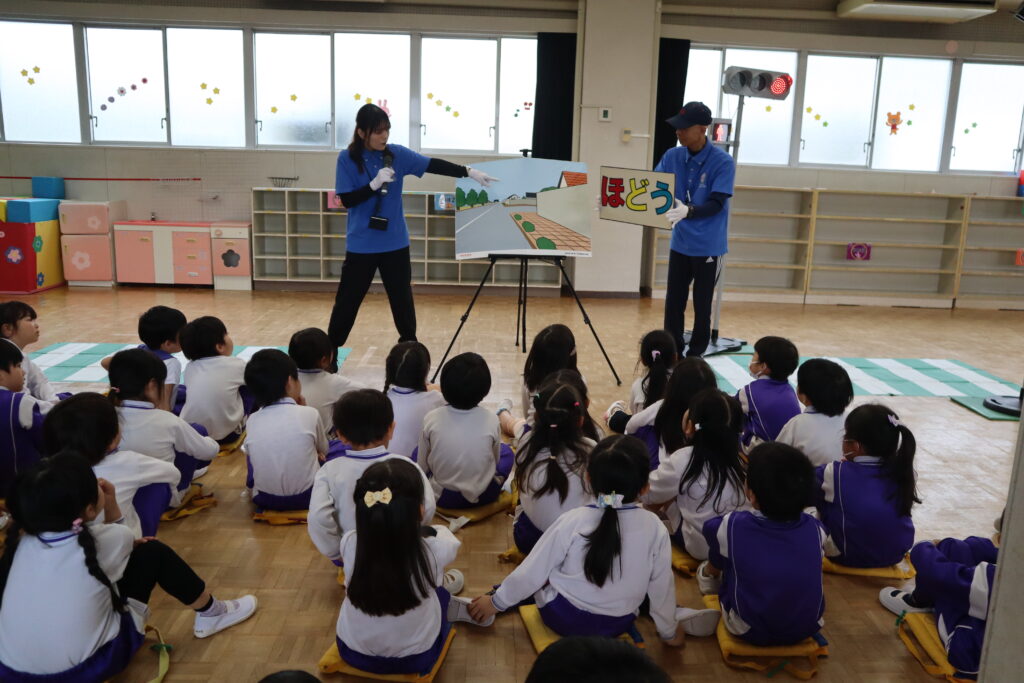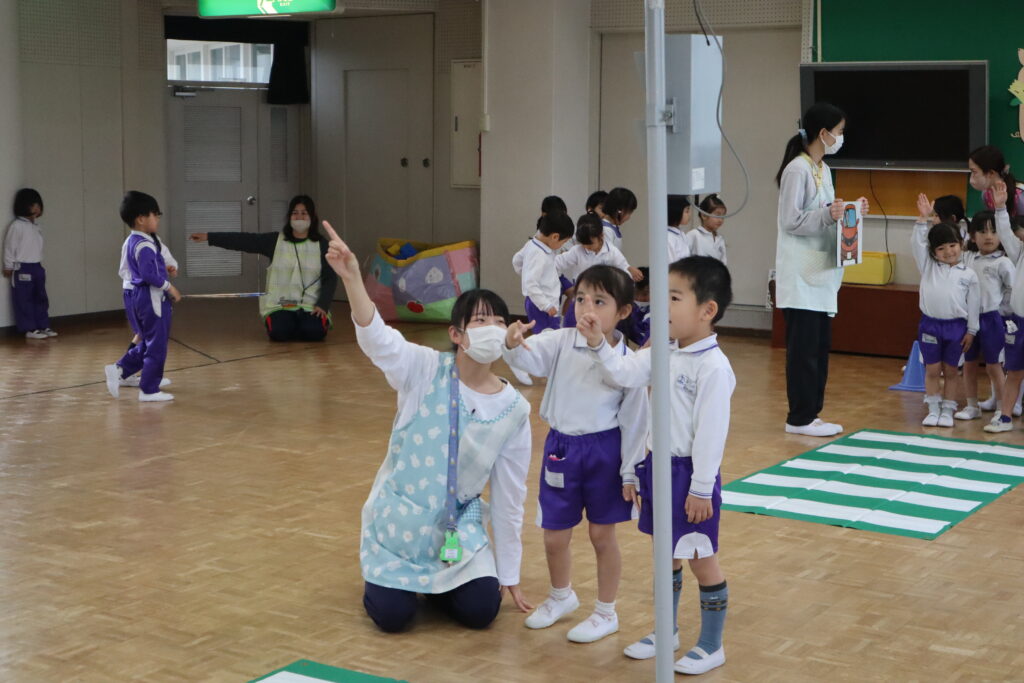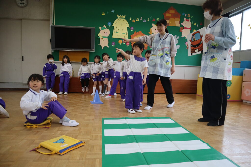 くま組、うさぎ組のお友だちが交通安全教室を行いました。横断歩道の渡り方や踏切の渡り方、飛び出し注意について話を聞き、実践しました。横断歩道の前では、一度止まり一歩下がってから、右手を挙げ、右左右の確認をして渡る。また、飛び出し注意では、壁などから車が飛び出していないかを覗き込んで確認することを教えてもらいました。実際の道路でも、しっかりと確認し渡れるようにご家庭でもお話を聞いてみて下さいね。