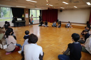 らいおん組、きりん組、ぱんだ組は遊戯室にて、担当の指導員の方にご協力頂き、道路ではどこを歩くのかについて、パネルシアターを見ながら学びました。