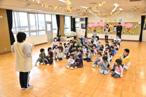 今日はおみせやさんごっこでした。らいおん組さんがお店屋さんになって、お菓子を売ってくれました。このために、らいおん組さんは係を決めたり、看板を作ったり、頑張って準備してきました。