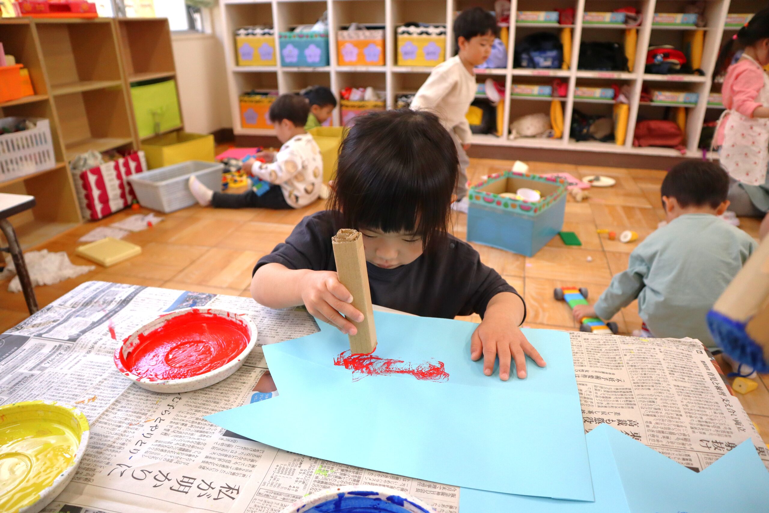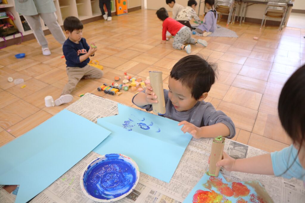 ぱんだ組さんはこいのぼりを作りました。絵具と丸めた段ボールを使って