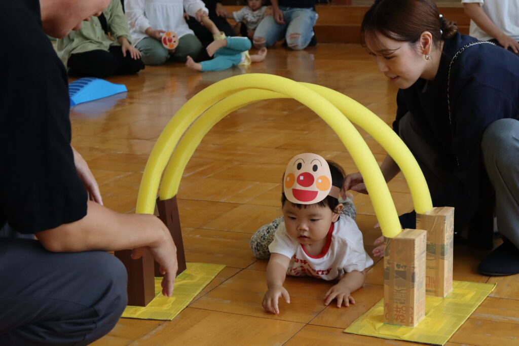 身体全体を使って楽しく遊び、最後は子どもたちがアンパンマンになって跳ぶ姿は