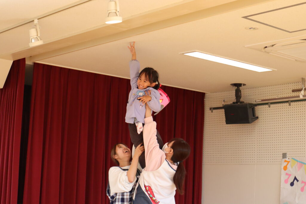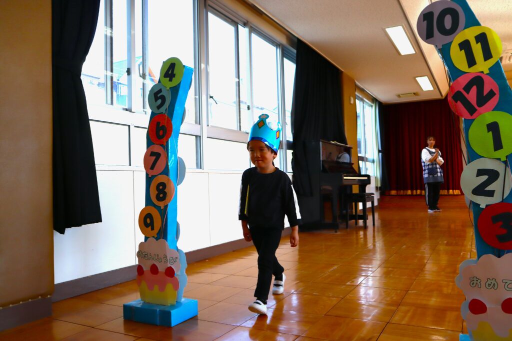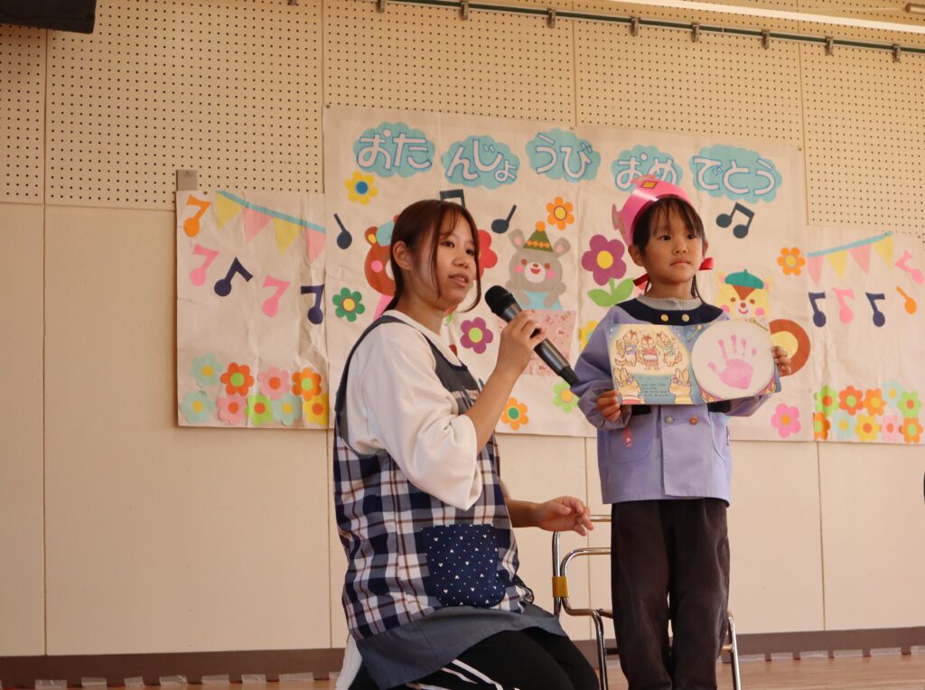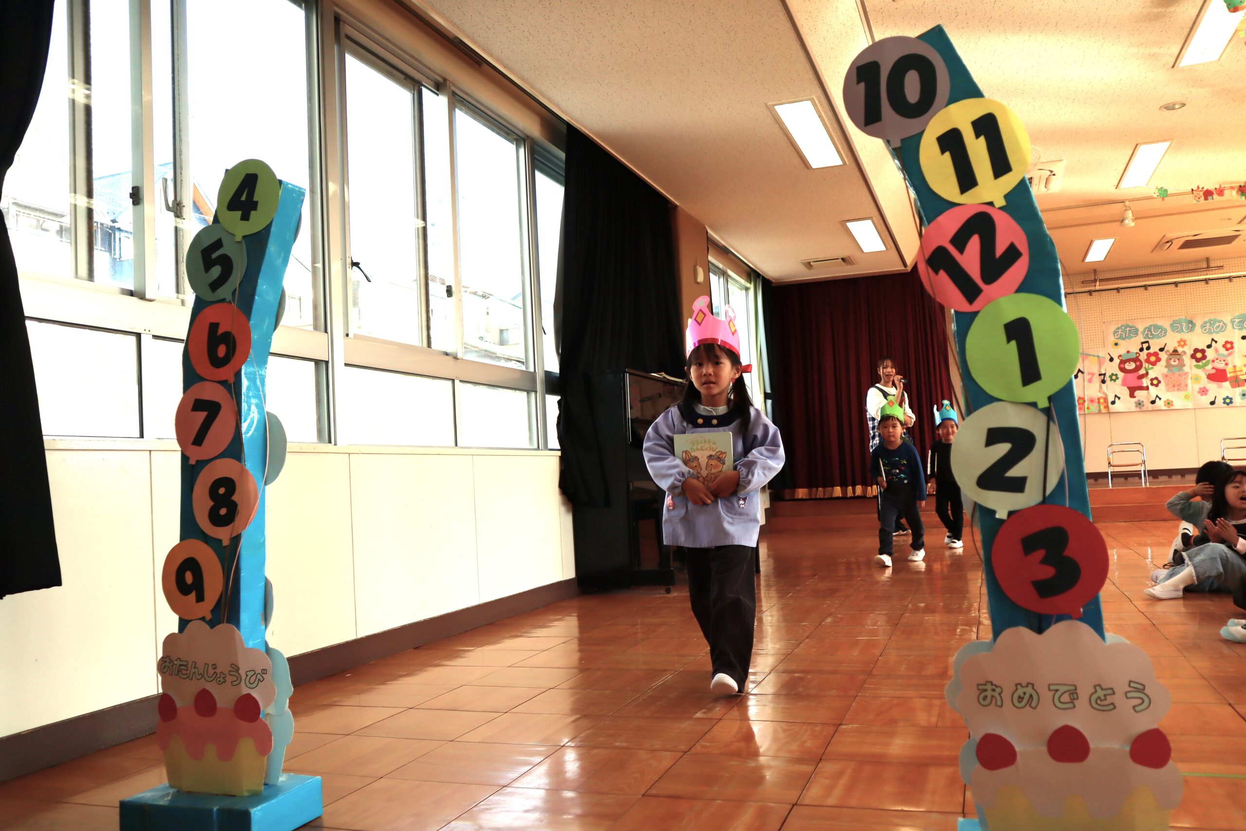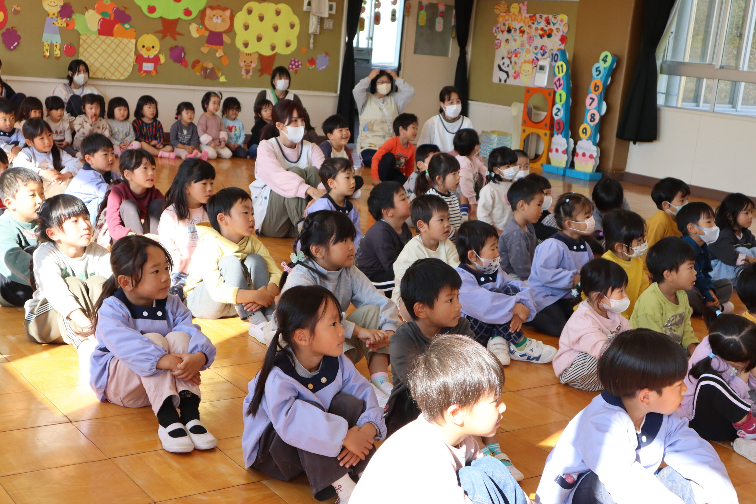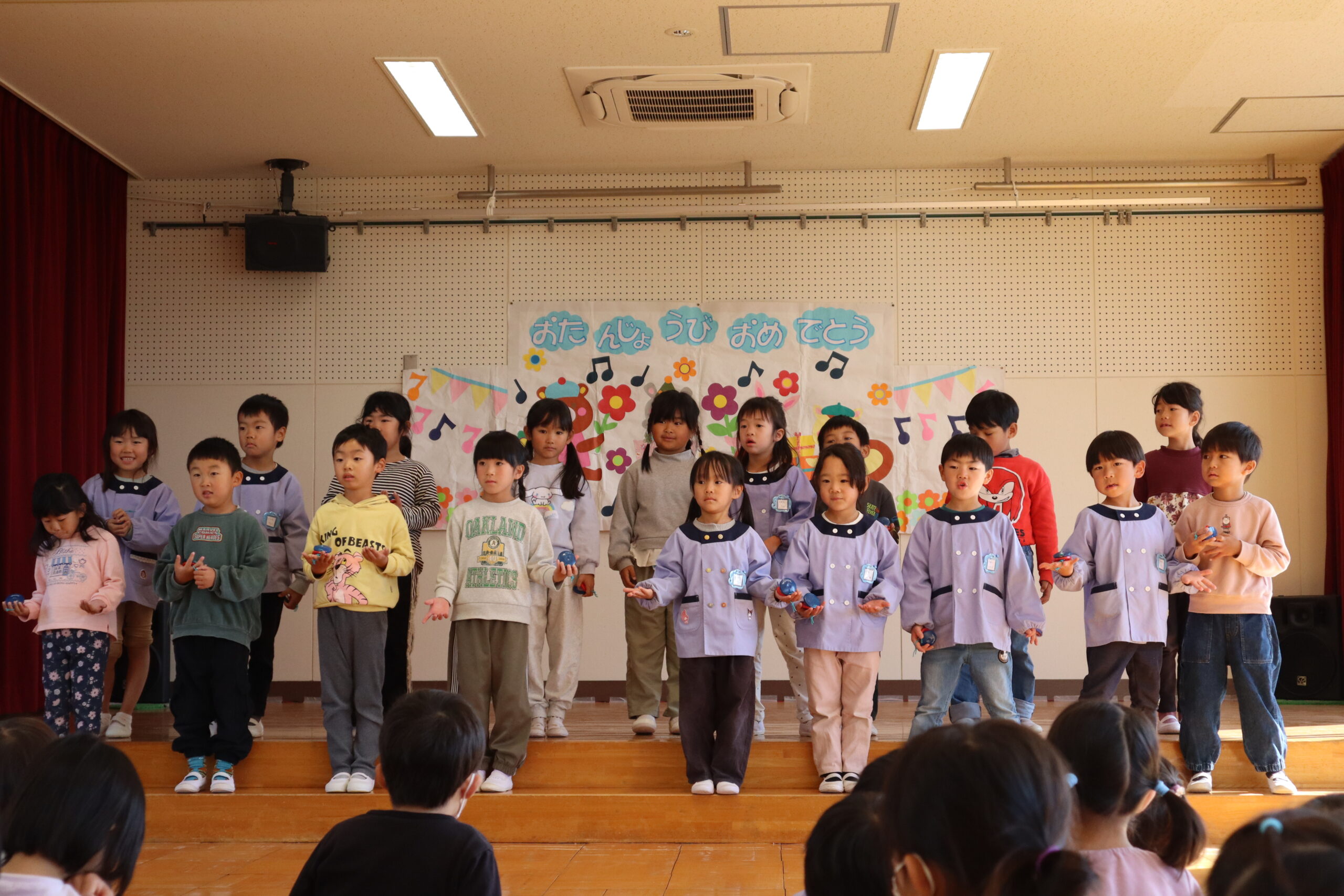 お誕生日会をしたよ(3歳以上児) 2025年11月28日 最終更新日時 : 2025年11月28日 unumaeast 今日は11月生まれのお誕生日会を行いました。少し緊張している様子でしたが、自信を持って質疑応答が出来ていました。らいおん組さんからはカスタネットを使って『山の音楽家』のプレゼントをしました。リズムに合わせて元気よく歌い、皆楽しい気持ちにさせてくれました。先生たちからは、『箱の中身はなんだろな』のゲームをしました。箱の中身が何かを当てる際、お友だちも答えを言わないように違うもので一生懸命教えようとしていたので正解したときはすごく盛り上がりました。