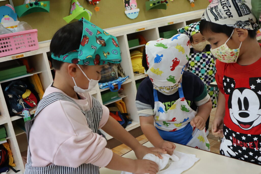 手洗い消毒をしっかり行いエプロンを着て、手袋を装着して行いました。