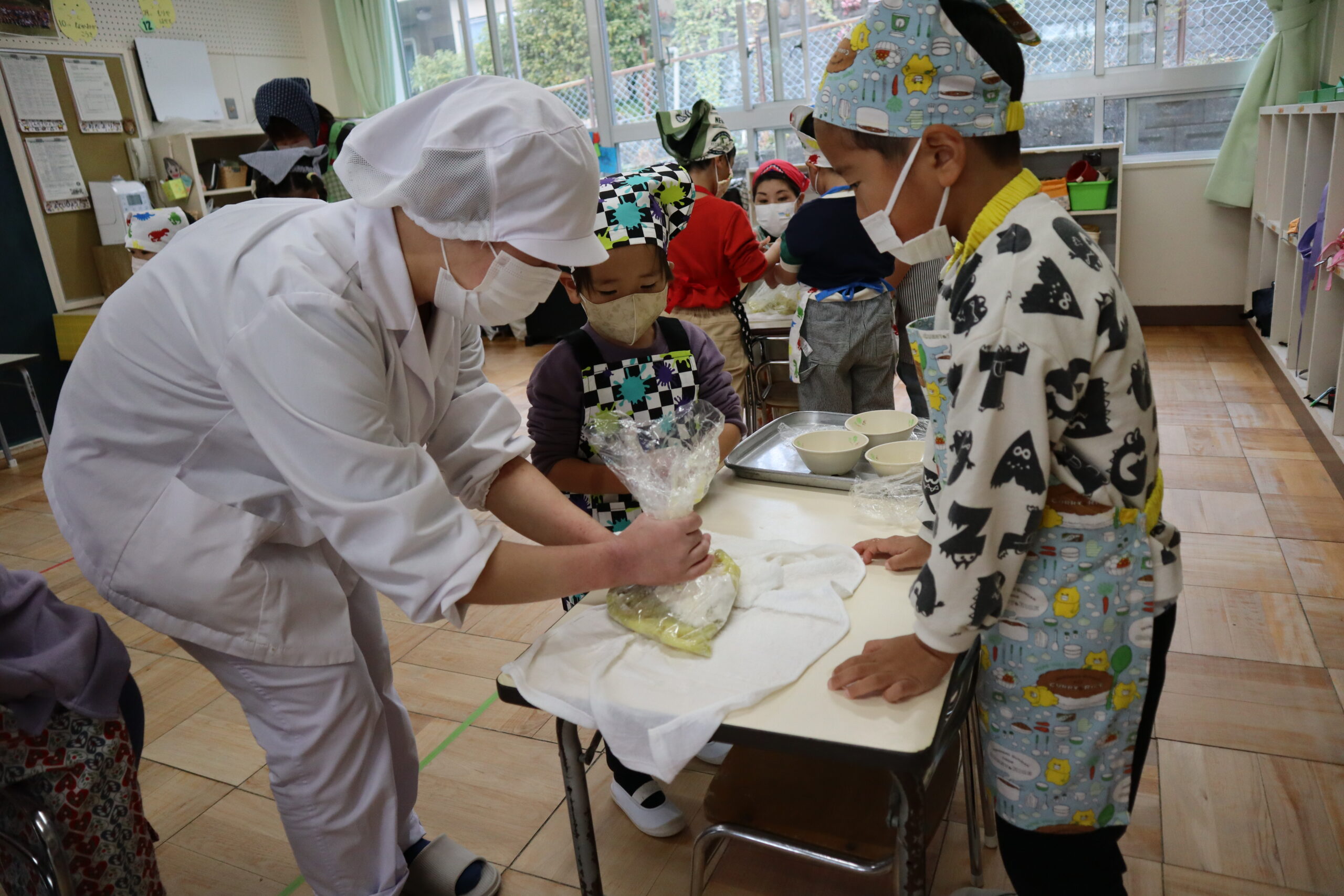 材料の確認・作り方を給食室の調理員さんと一緒にして、一生懸命に作っていました。
