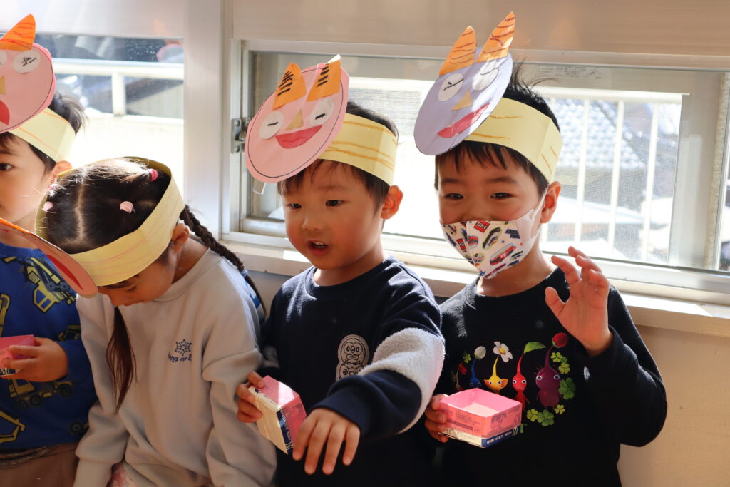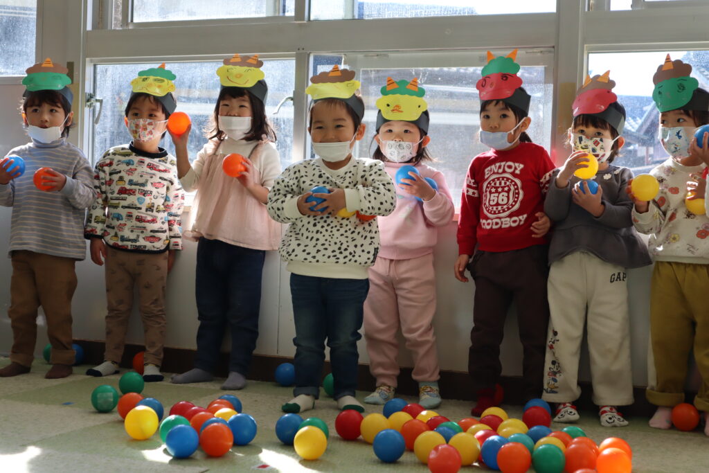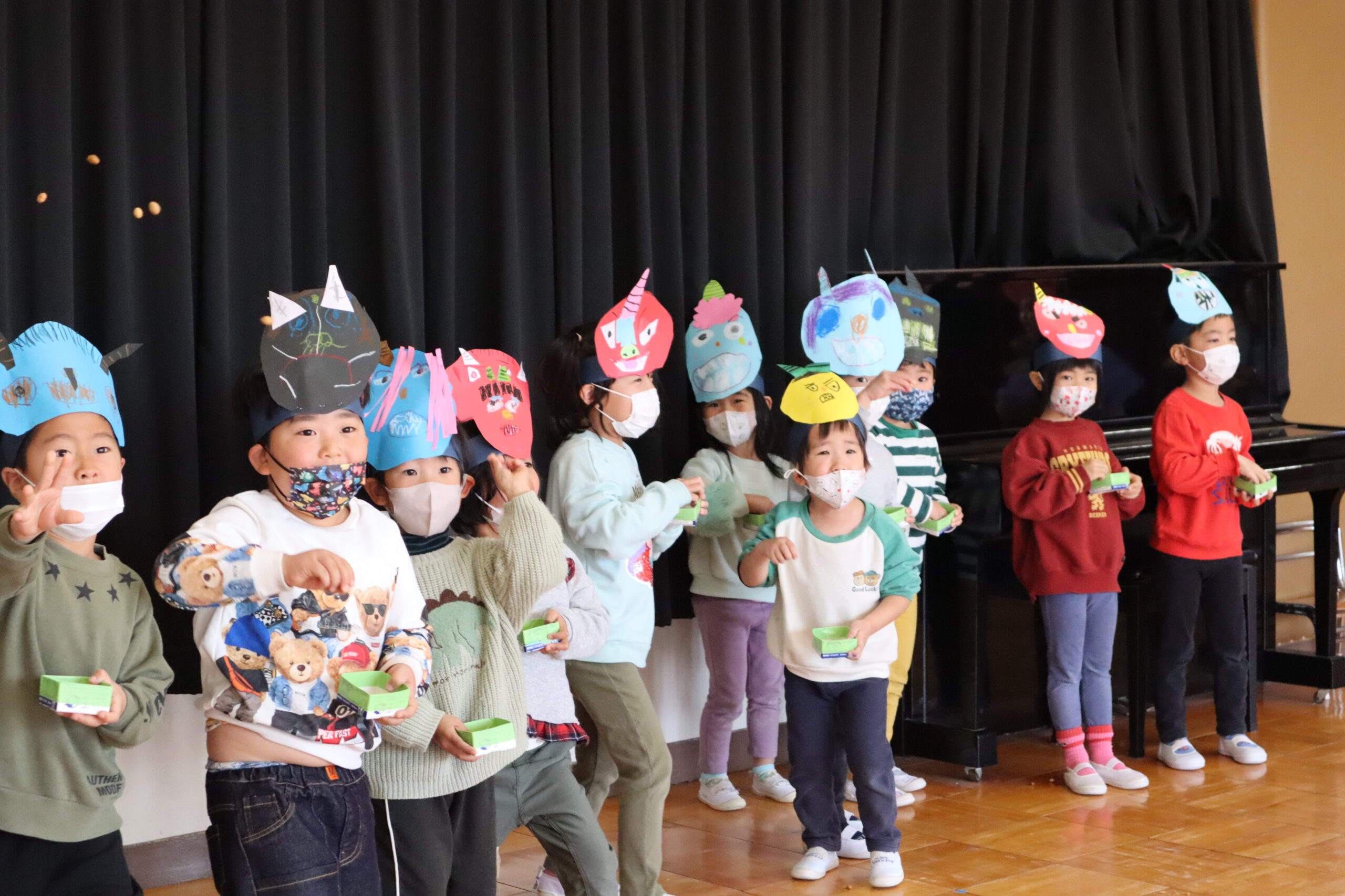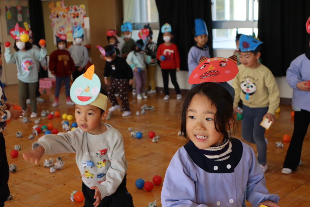 豆まきをしたよ! 2026年2月3日 最終更新日時 : 2026年2月4日 unumaeast 節分の行事として、豆まきをしました。最初は節分についての○✕クイズをしました。皆「✕かな?」や、「絶対に○!」など最後まで楽しくクイズをしました。3歳以上児達は遊戯室に集まり鬼が登場すると怖くて泣いてしまった子もいましたが、「鬼は外!」と力いっぱい豆を投げていました。3歳未満児達も各部屋で豆まきをしましたが、泣いてしまう子もいる中大きい声で「鬼は外!」とカラーボールを豆に見立てて投げました。最後は福の神が来て、お友だちは少し安心した表情をしていました。