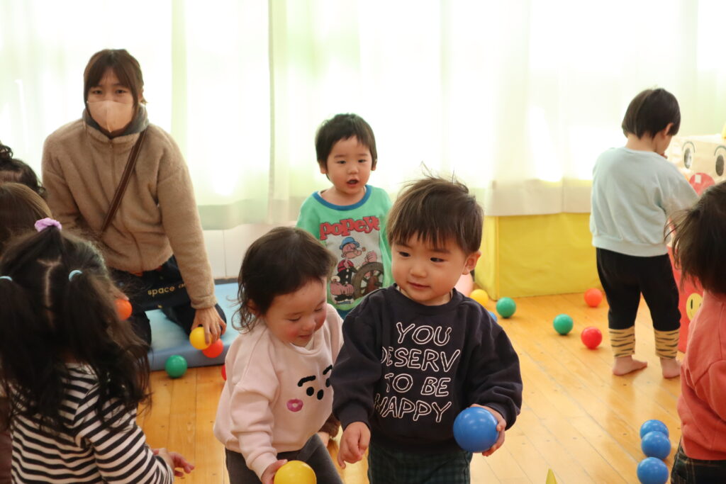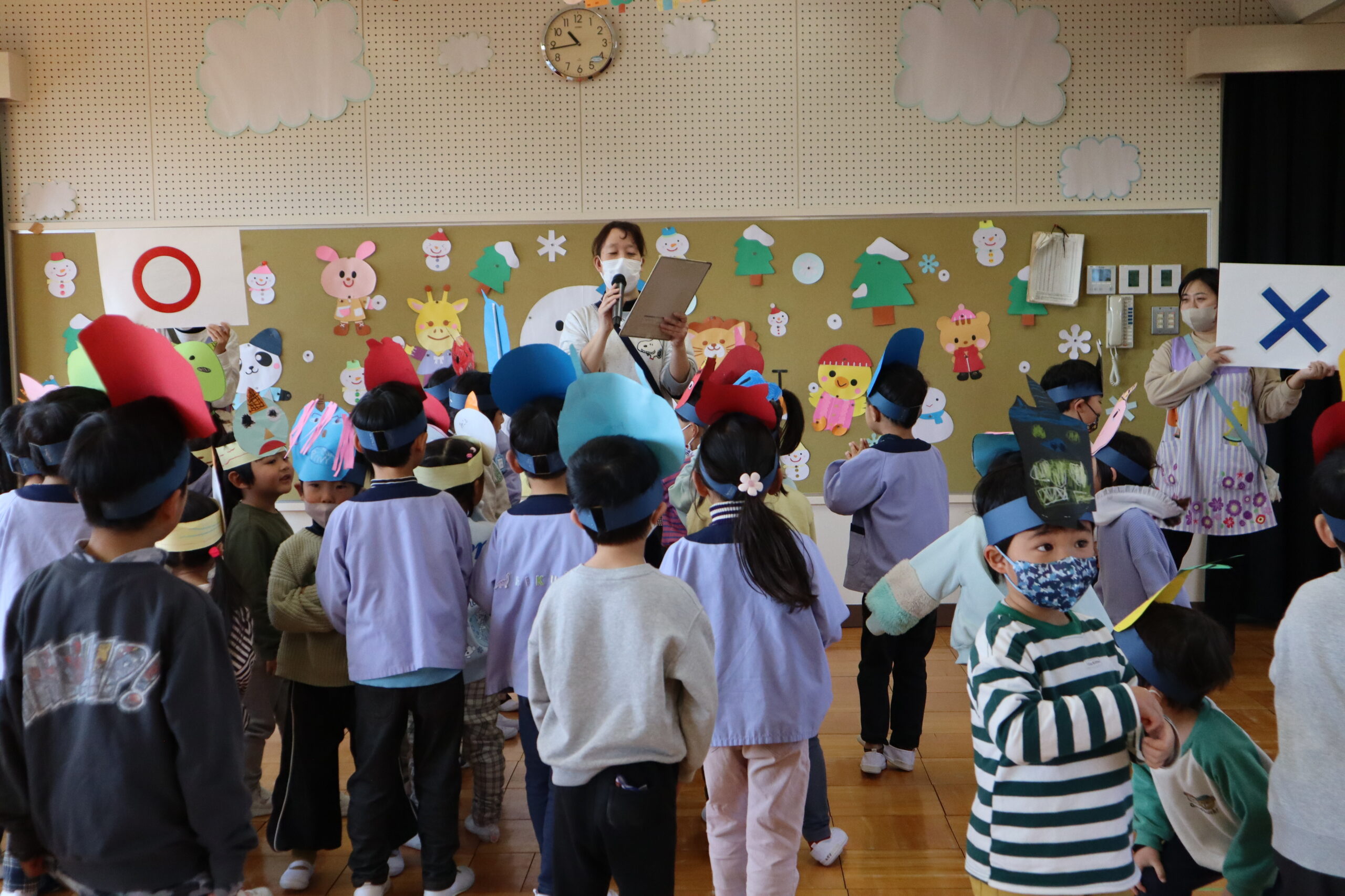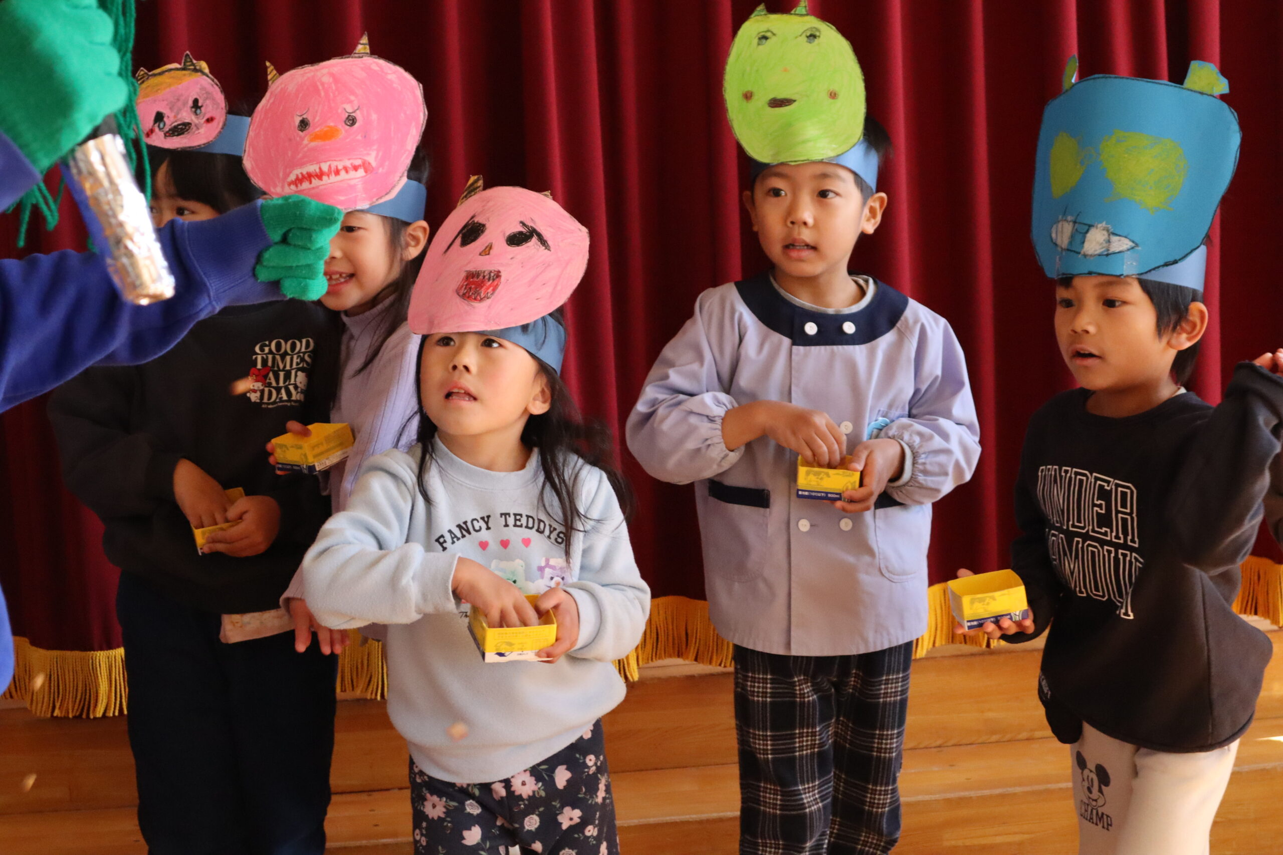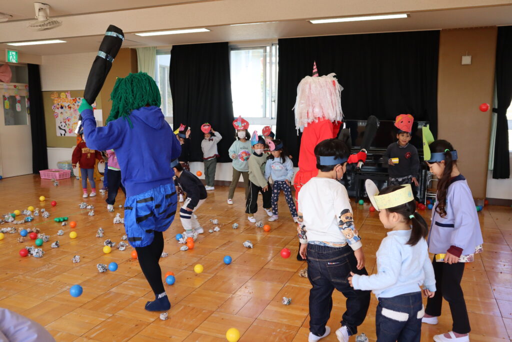 豆まきをしたよ! 2026年2月3日 最終更新日時 : 2026年2月4日 unumaeast 節分の行事として、豆まきをしました。最初は節分についての○✕クイズをしました。皆「✕かな?」や、「絶対に○!」など最後まで楽しくクイズをしました。3歳以上児達は遊戯室に集まり鬼が登場すると怖くて泣いてしまった子もいましたが、「鬼は外!」と力いっぱい豆を投げていました。3歳未満児達も各部屋で豆まきをしましたが、泣いてしまう子もいる中大きい声で「鬼は外!」とカラーボールを豆に見立てて投げました。最後は福の神が来て、お友だちは少し安心した表情をしていました。