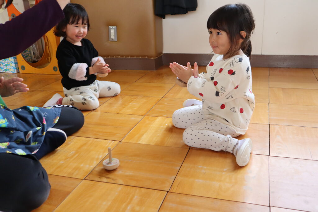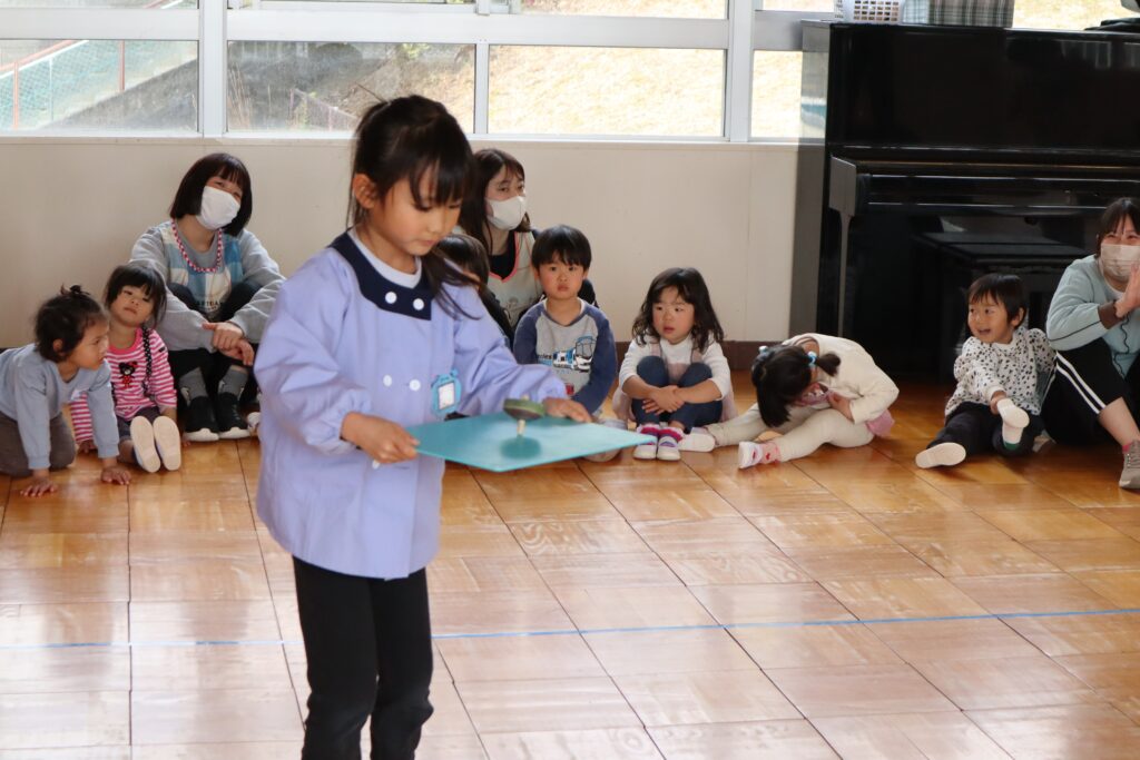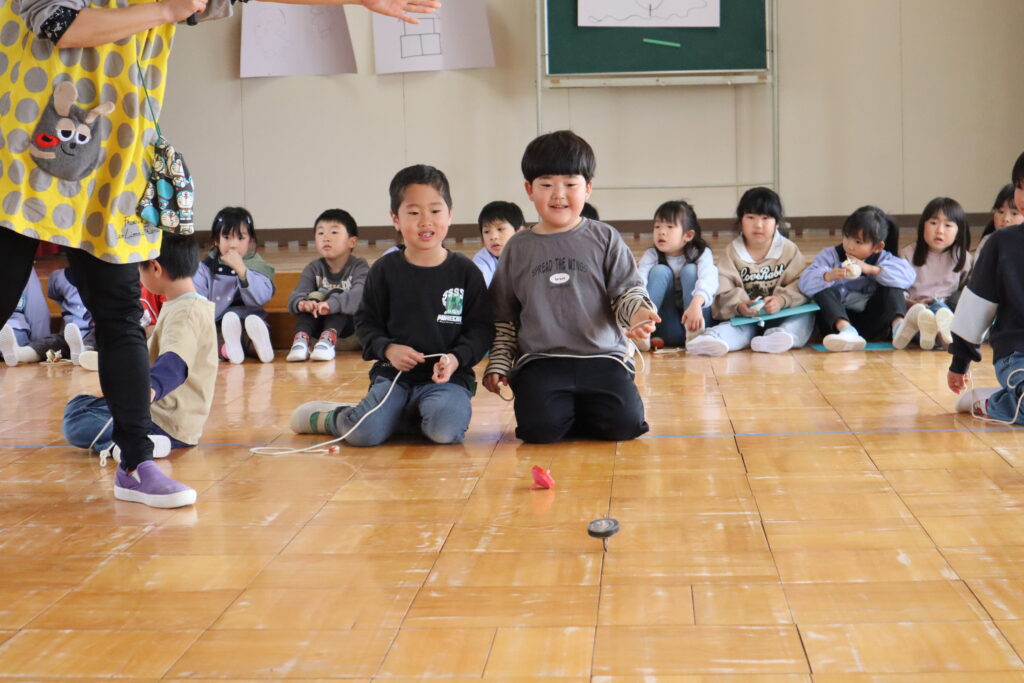その後は異年齢交流をし、みんなでこまを回しました。上手くできない子に教えてあげる姿もありましたが、