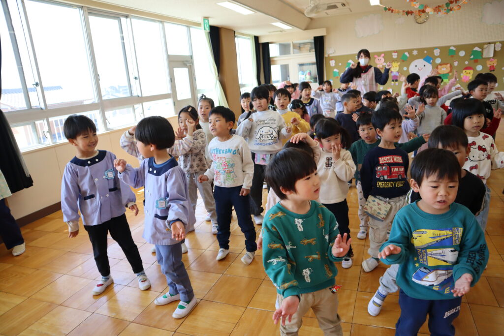 お誕生日会(3歳以上児) 2026年3月11日 最終更新日時 : 2026年3月11日 unumaeast 今日は今年度最後のお誕生日会を行いました。2人のお友だちがひとつ大きくなり、大きな声で質問に答えていました。クラスの出し物はきりん組さんからお歌のプレゼントで、みんな上手に歌えていました。保育士からの出し物は「お店に並んだ品物」を行いました。初めてやる手遊びでしたが、みんな楽しんでおり、「お部屋でもやりたい!」と言ってくれるくらい楽しんでいました。