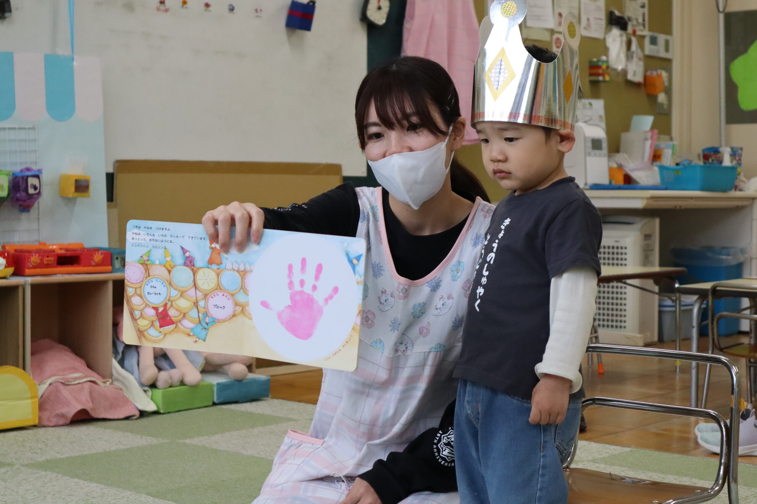 りす・ひよこ組さんは、大きい絵本の「おべんとくん」を見ました。みんな落ち着いて見ることができていました。