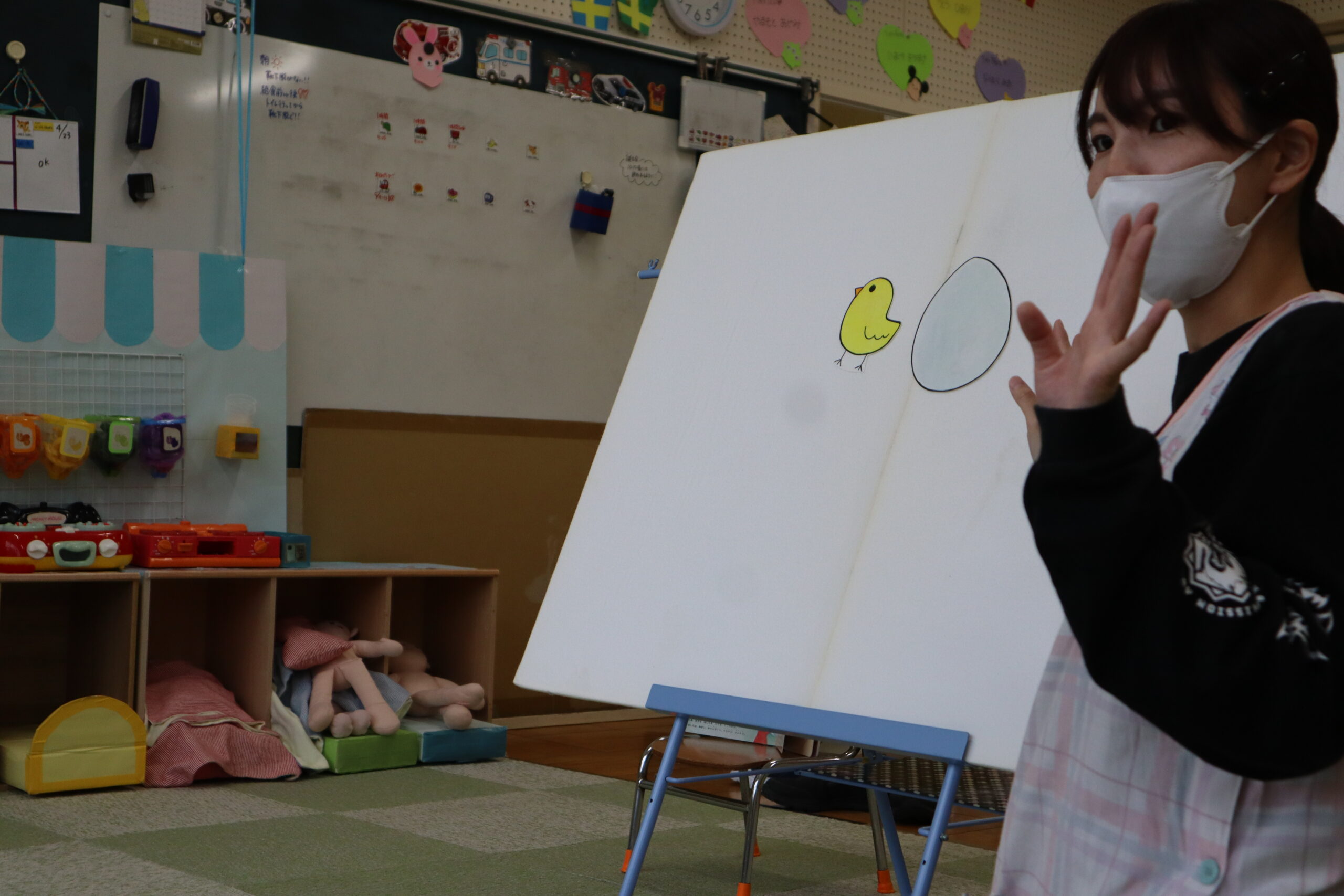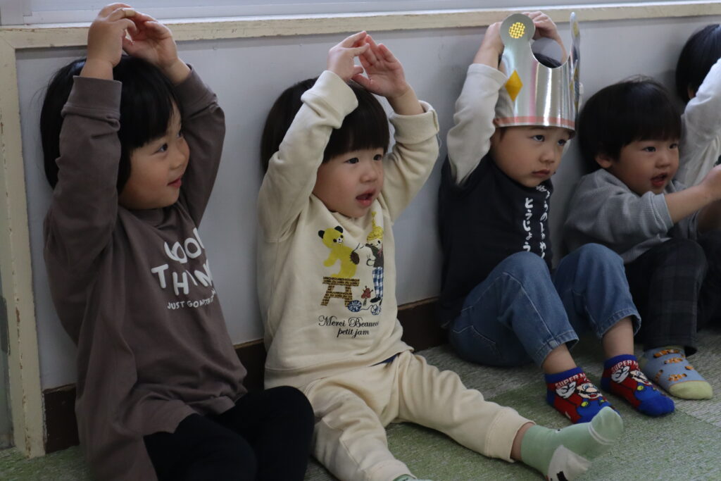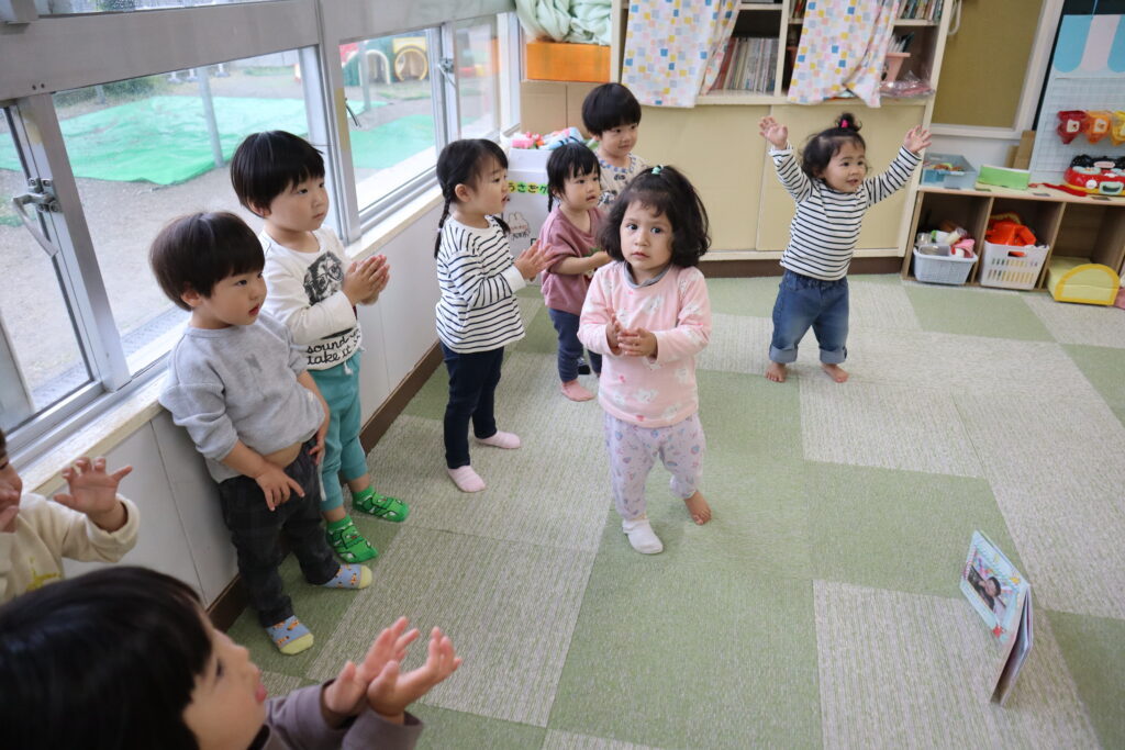うさぎ組さんはペープサートの「まあるいたまご」をしました。みんな真似っこをして楽しく最後まで見ていました。