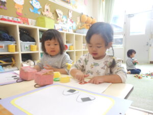 今日はお部屋でコーナー遊びをしました。自分の好きな遊びが準備されているコーナーに目を輝かせ夢中になって遊ぶ姿が見られました‼保育士とお話ししながら楽しい時間を過ごすことができましたよ♪